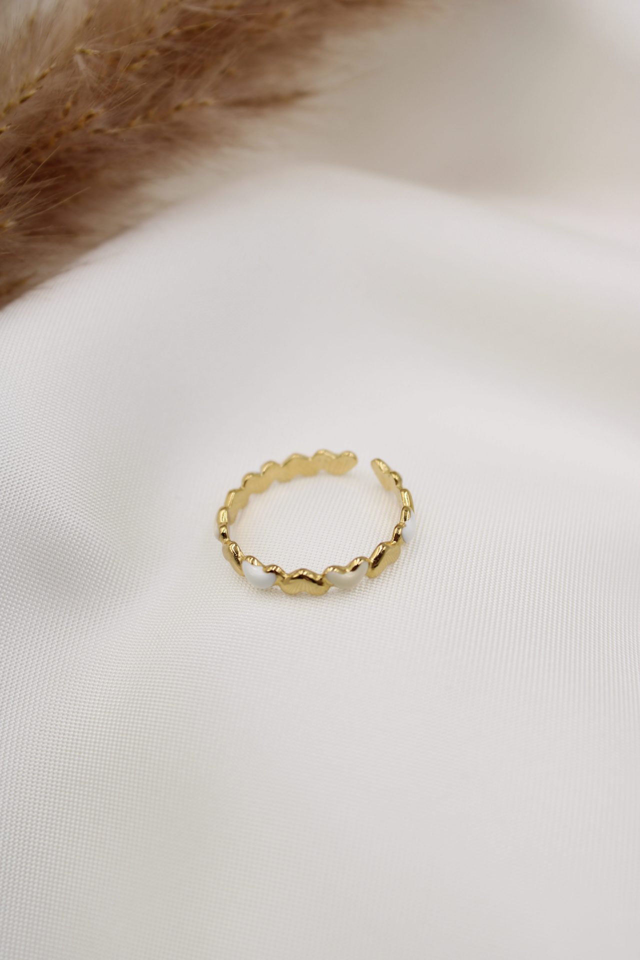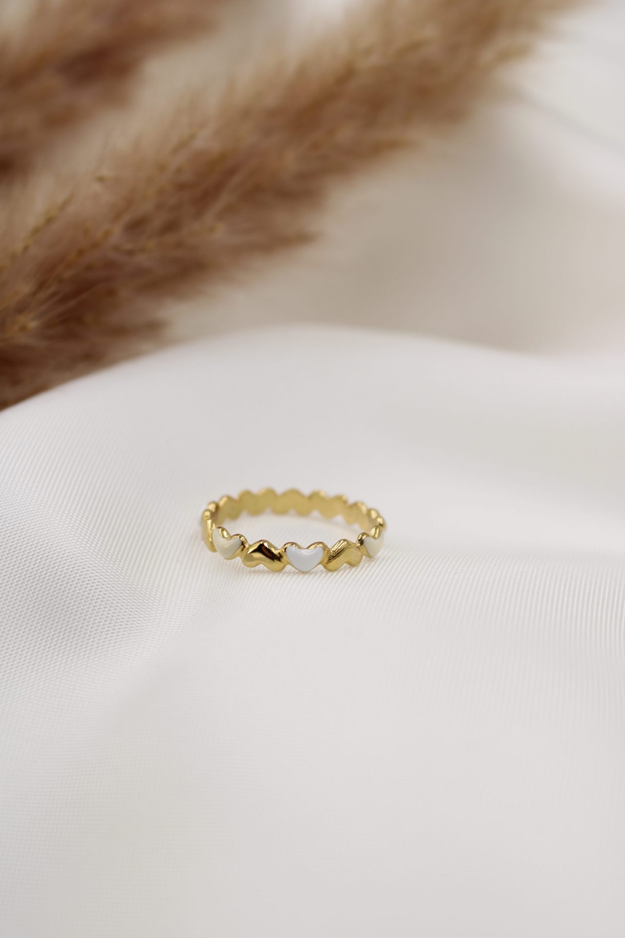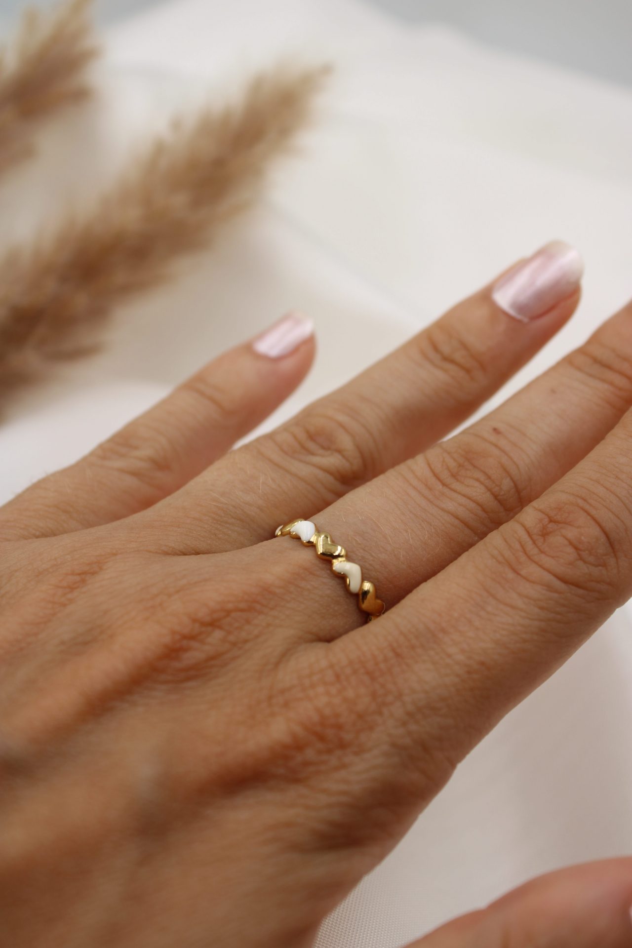 Laissez-vous séduire par cette ravissante bague, un bijou délicat orné de petits cœurs entrelacés. L’or et le blanc s’harmonisent à merveille pour un style à la fois romantique et moderne.