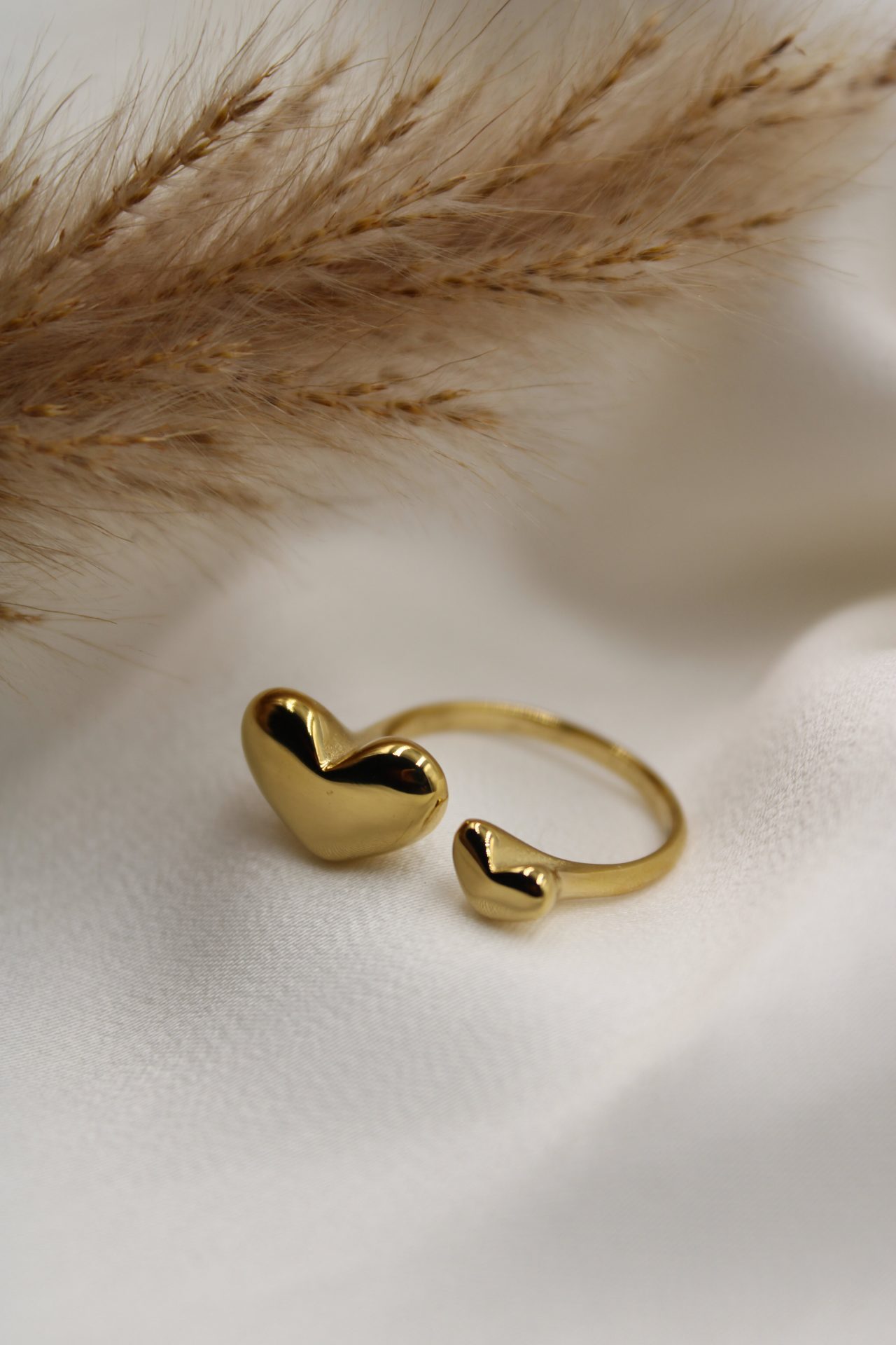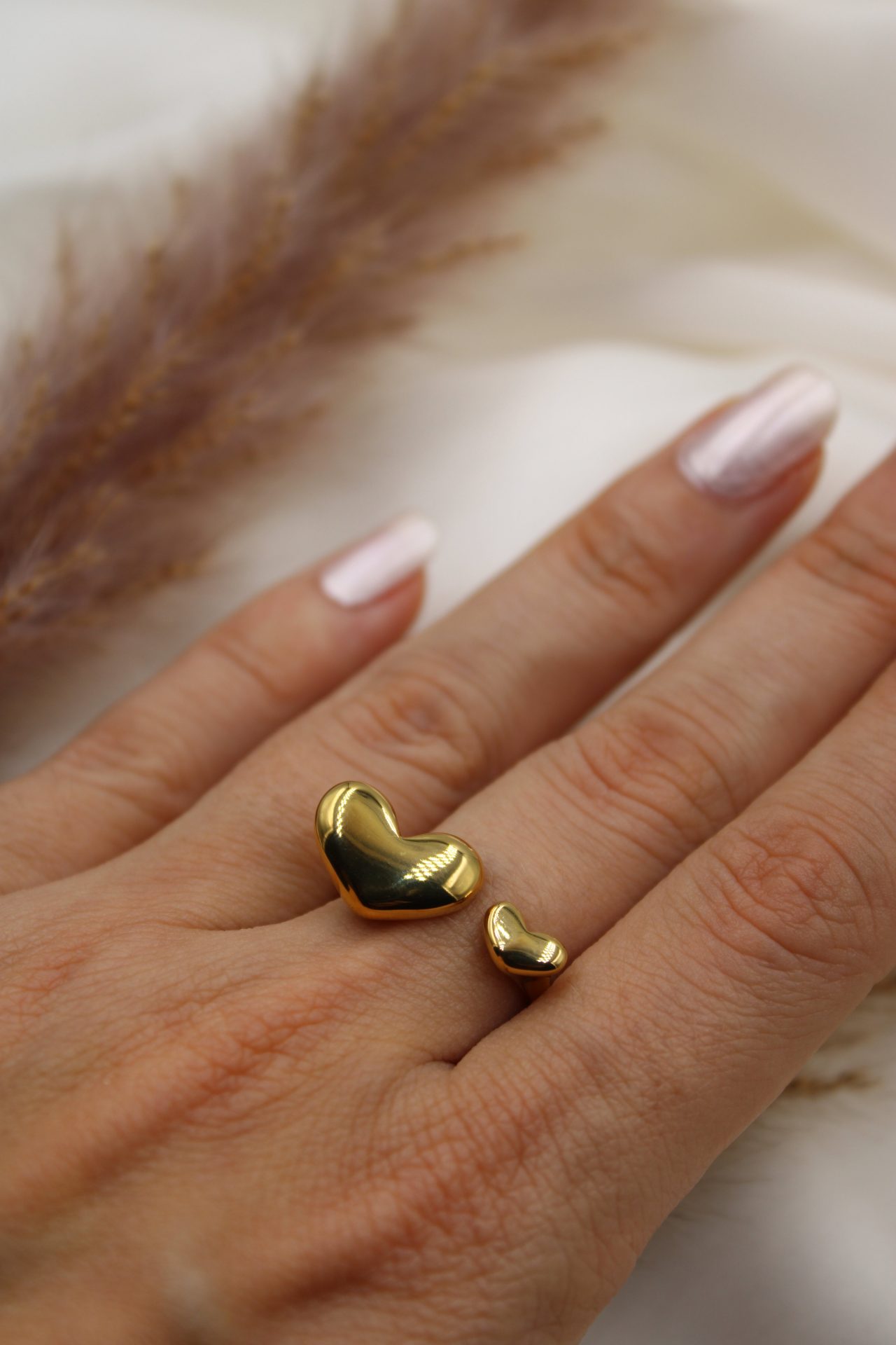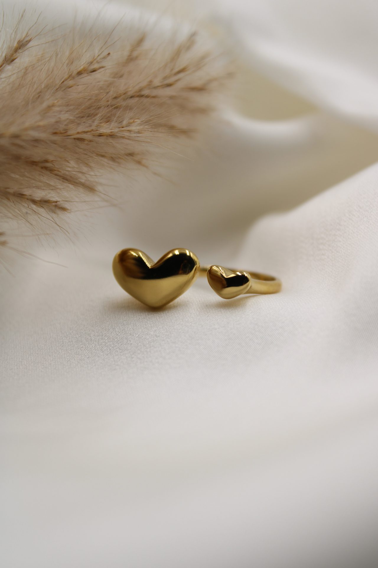 Cette bague dorée, telle une étreinte infinie, se termine par deux cœurs lumineux, l’un abritant l’autre. Leur éclat tendre et harmonieux murmure des promesses d’amour éternel. Un bijou poétique, célébrant la douce danse des âmes entrelacées.