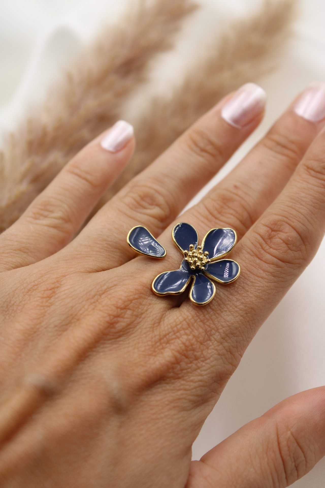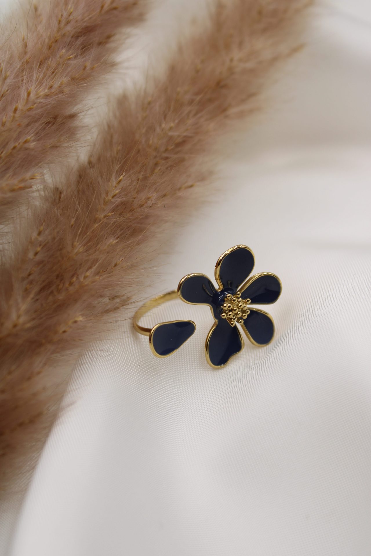 Comme un jeu tendre et intemporel, cette bague fleur éclot au creux de votre main. Ses pétales bleu profond, délicatement bordés d’or, captent la lumière et révèlent toute la poésie d’un bouquet éternel.