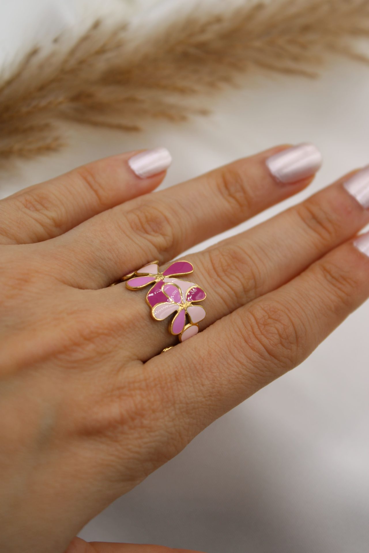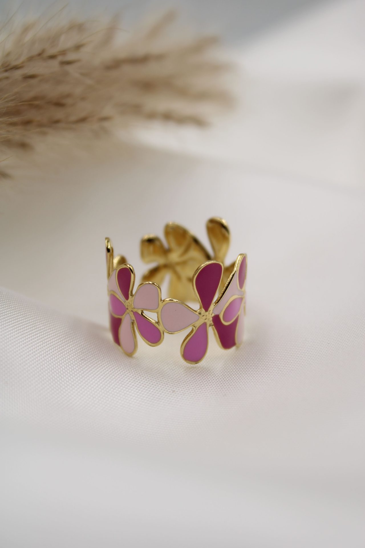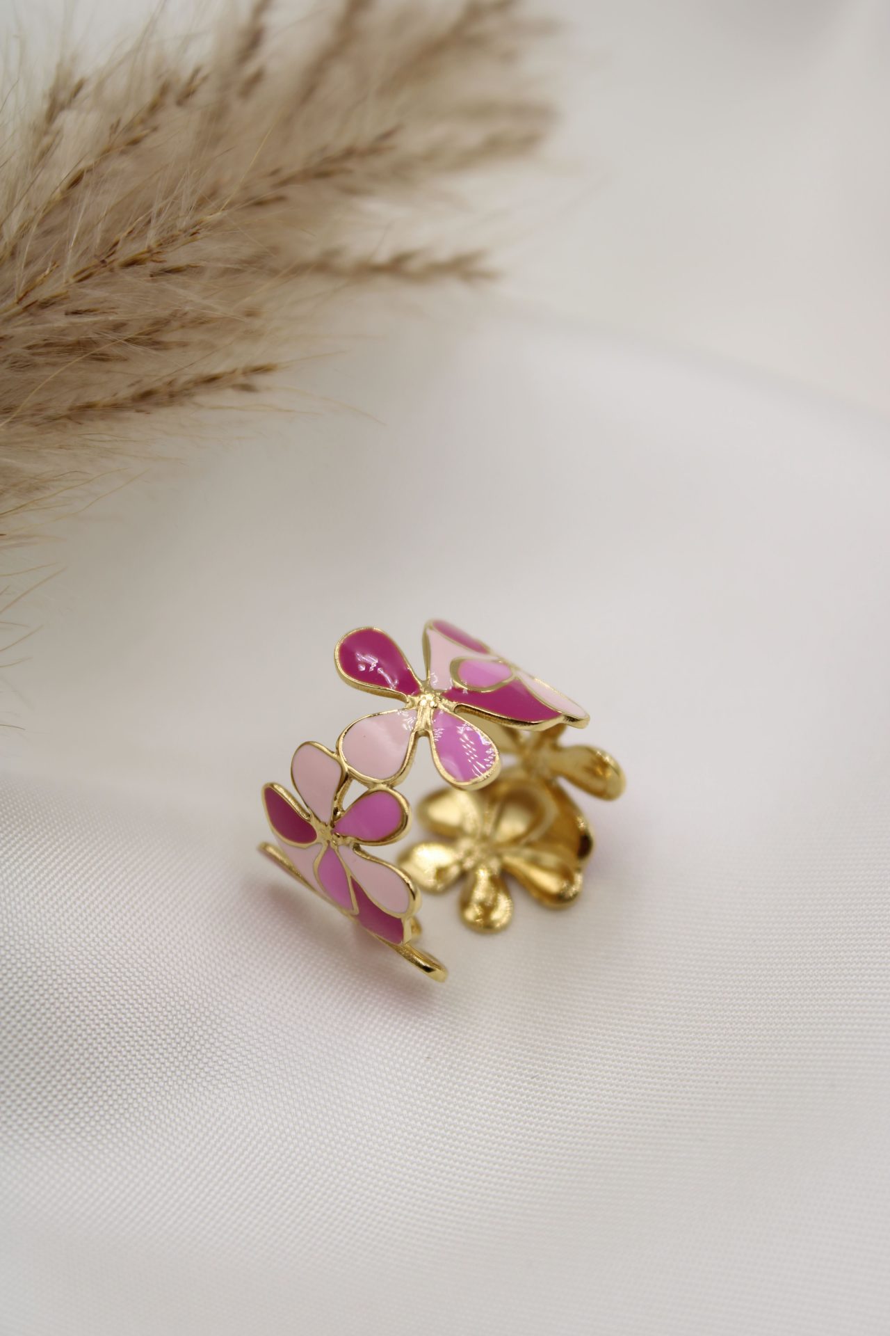Cette bague est une pièce délicate et charmante, ornée de fleurs en émail rose et violet qui lui confère une élégance intemporelle. Les fleurs, avec leurs couleurs douces, ajoutent une touche de fraîcheur et de féminité à la bague. Le design floral évoque la beauté de la nature et apporte une sensation de légèreté, parfaite pour égayer n’importe quelle tenue.