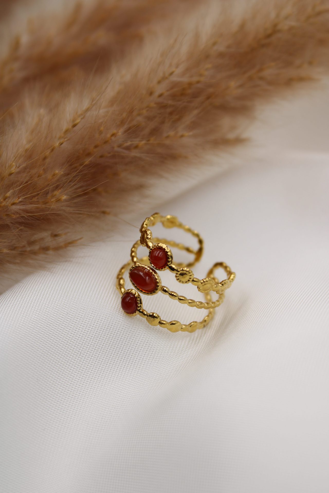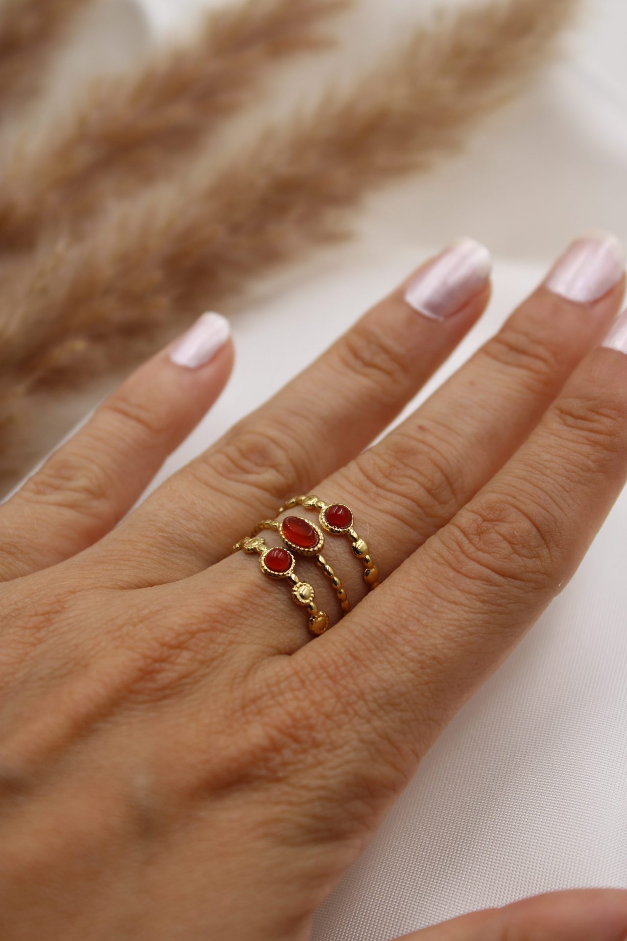 Élégante et raffinée, cette bague dorée se distingue par ses trois anneaux délicatement torsadés, ornés de pierres rouges intenses. Sa structure en trio lui donne l’allure d’une petite couronne royale, fine et majestueuse à la fois.