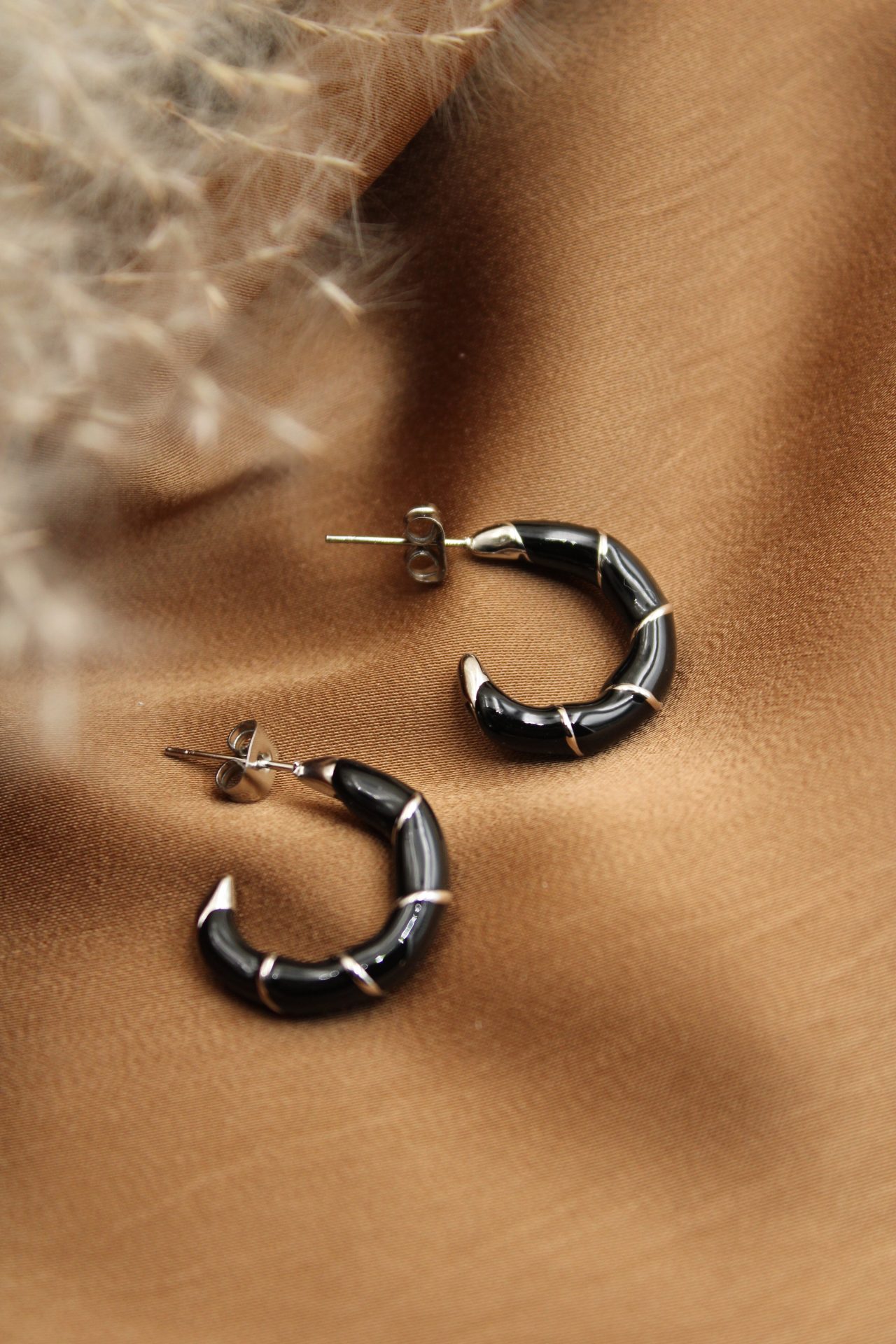 Indispensable, ces boucles d’oreilles. Avec leur format épais, leur design torsadé mélangeant noir et argent qui ajoute une touche sophistiqué en toute discrétion. Ces boucles d’oreilles ont tout pour plaire.