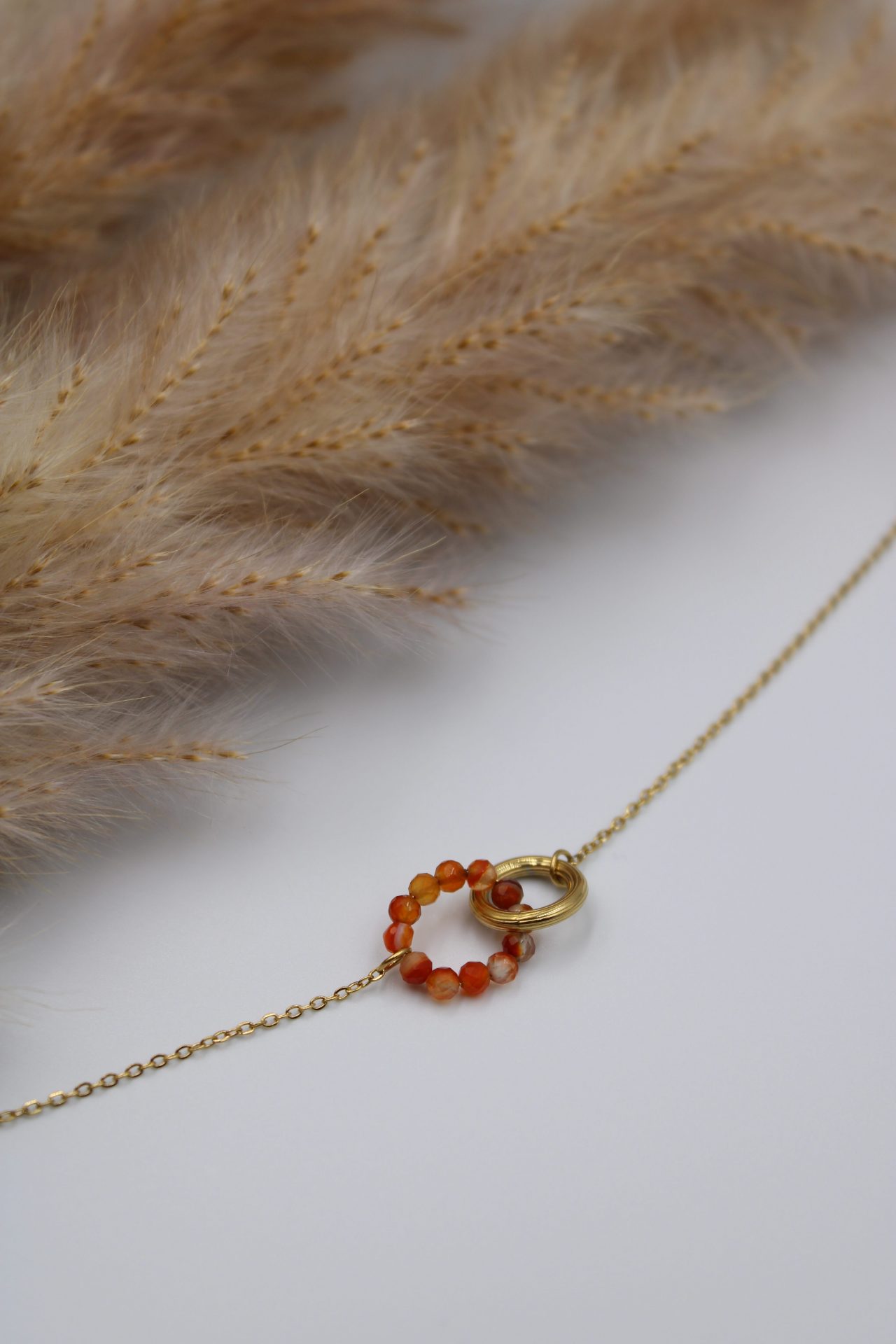 Découvrez l’élégance subtile de notre bracelet à double anneau. Ce bijou raffiné se compose d’une délicate chaîne doré soutenant deux anneaux entrelacés : l’un, simple et lisse, doré, symbole d’éternité, et l’autre, orné de fines perles orange qui captent la lumière avec douceur. Ce bracelet est parfait pour ajouter une touche de couleur discrète et de sophistication à votre poignet.