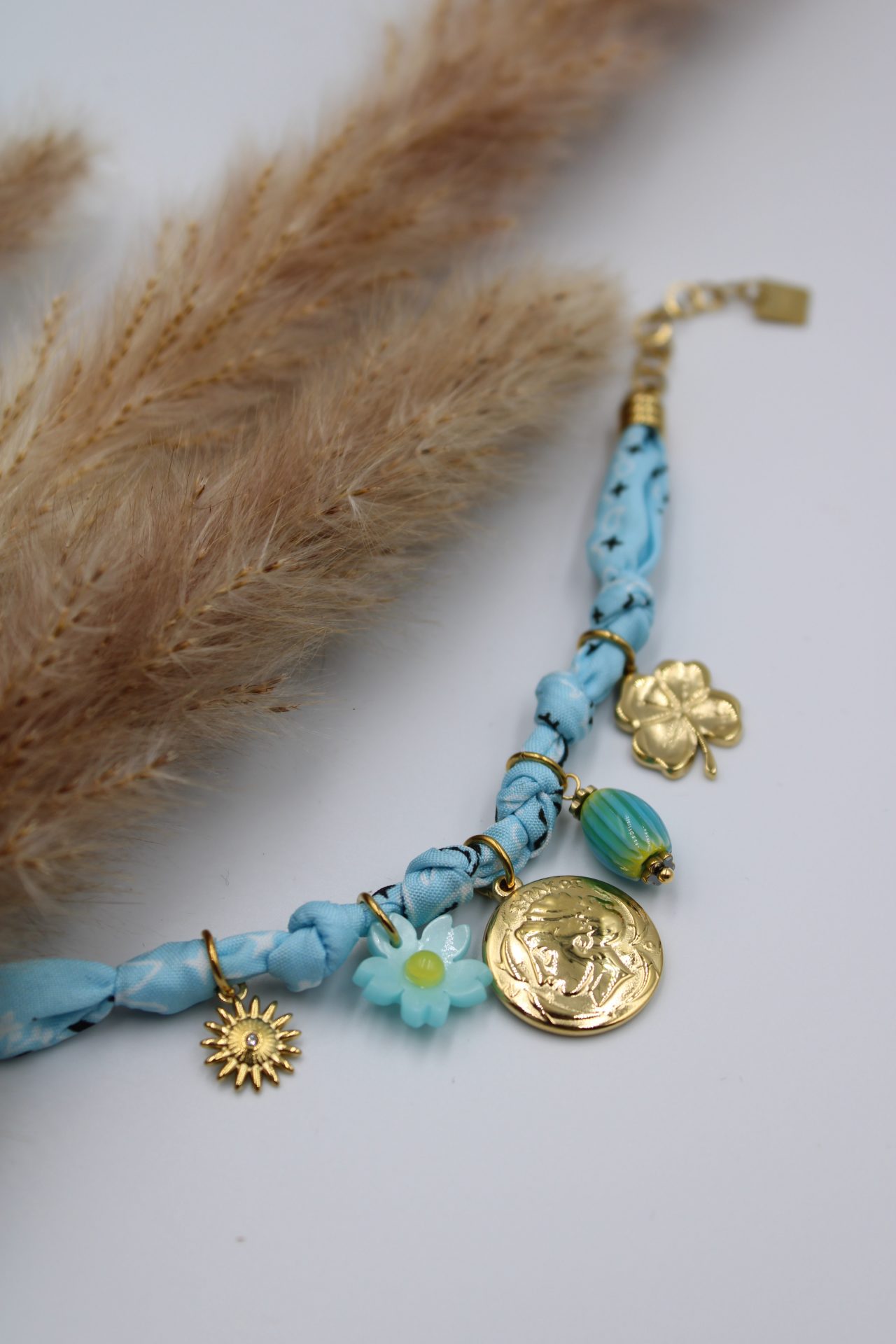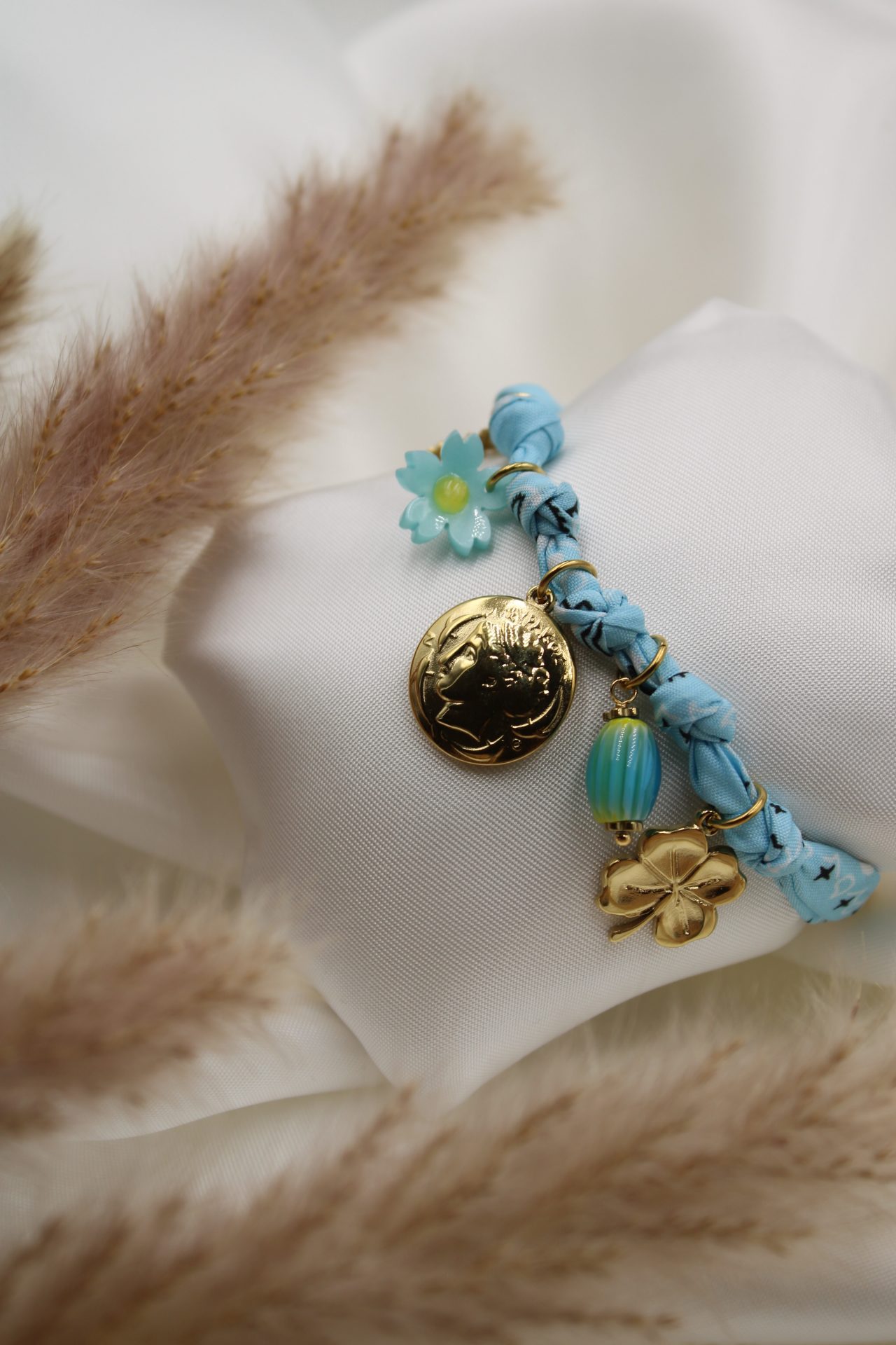 Ce bracelet en tissu bleu clair est une pièce unique et élégante, ornée de breloques dorées qui ajoutent une touche de charme. Les breloques incluent un trèfle à quatre feuilles, symbole de chance, un soleil rayonnant, une fleur délicate, et un médaillon représentant une image religieuse, chacun apportant une signification particulière . Son design raffiné et ses détails dorés créent un contraste captivant avec le tissu, faisant de ce bracelet un accessoire à la fois stylé et significatif. Parfait pour ajouter une note de lumière et de personnalité à n’importe quelle tenue. Ce bracelet est un véritable porte-bonheur qui saura séduire ceux qui le portent.