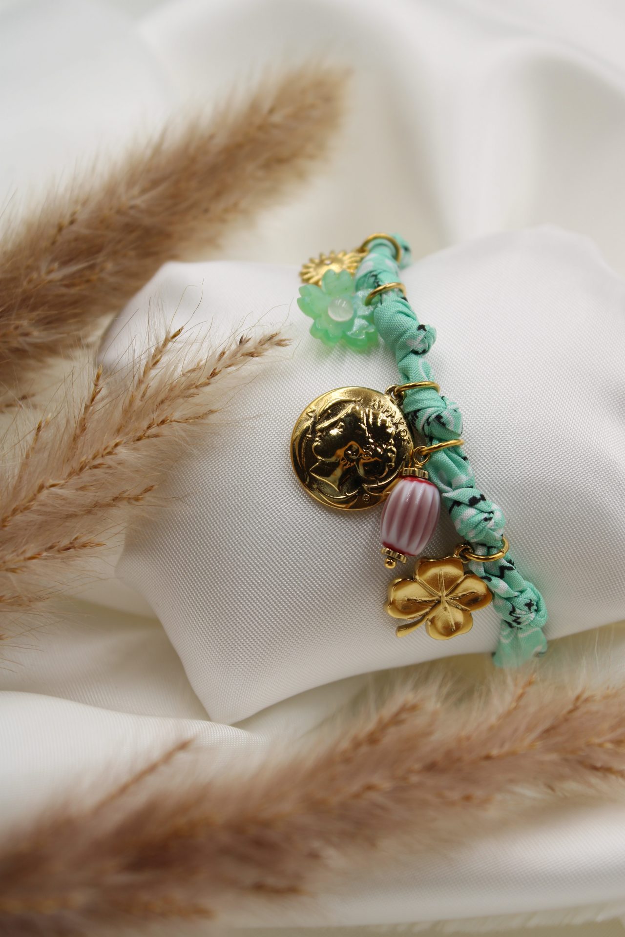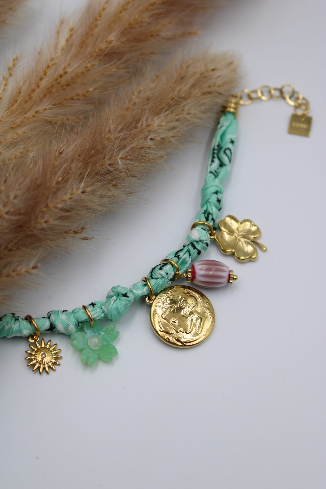 Ajoutez une touche d’élégance à votre style avec notre bracelet en tissu bandana vert. Ce bijou unique est orné de charmantes breloques dorées, comprenant un trèfle à quatre feuilles, un soleil radieux, une délicate fleur et un médaillon. Que ce soit pour une occasion spéciale ou pour rehausser votre tenue quotidienne, ce bracelet saura attirer tous les regards.