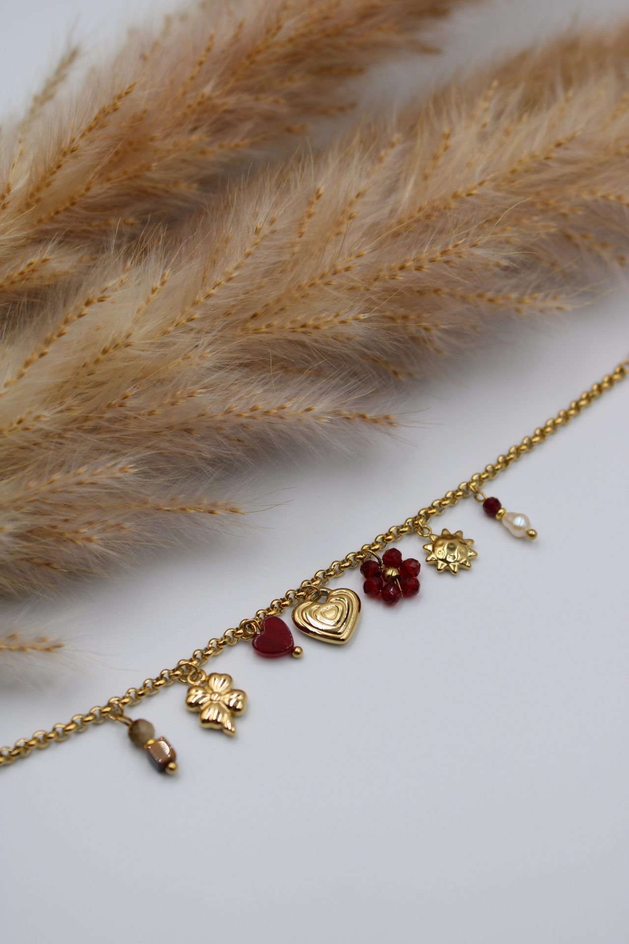 Ce bracelet est un véritable bijou pour le quotidien. Sa chaîne fine et délicate en or est ornée de breloques attachantes : un cœur gravé, une fleur, un soleil et de petites pierres rouges et une perle. Les matériaux utilisés sont de haute qualité, assurant une durée de vie optimale de votre bracelet. Parfait pour ajouter une touche de féminité et d’élégance à toutes vos tenues.