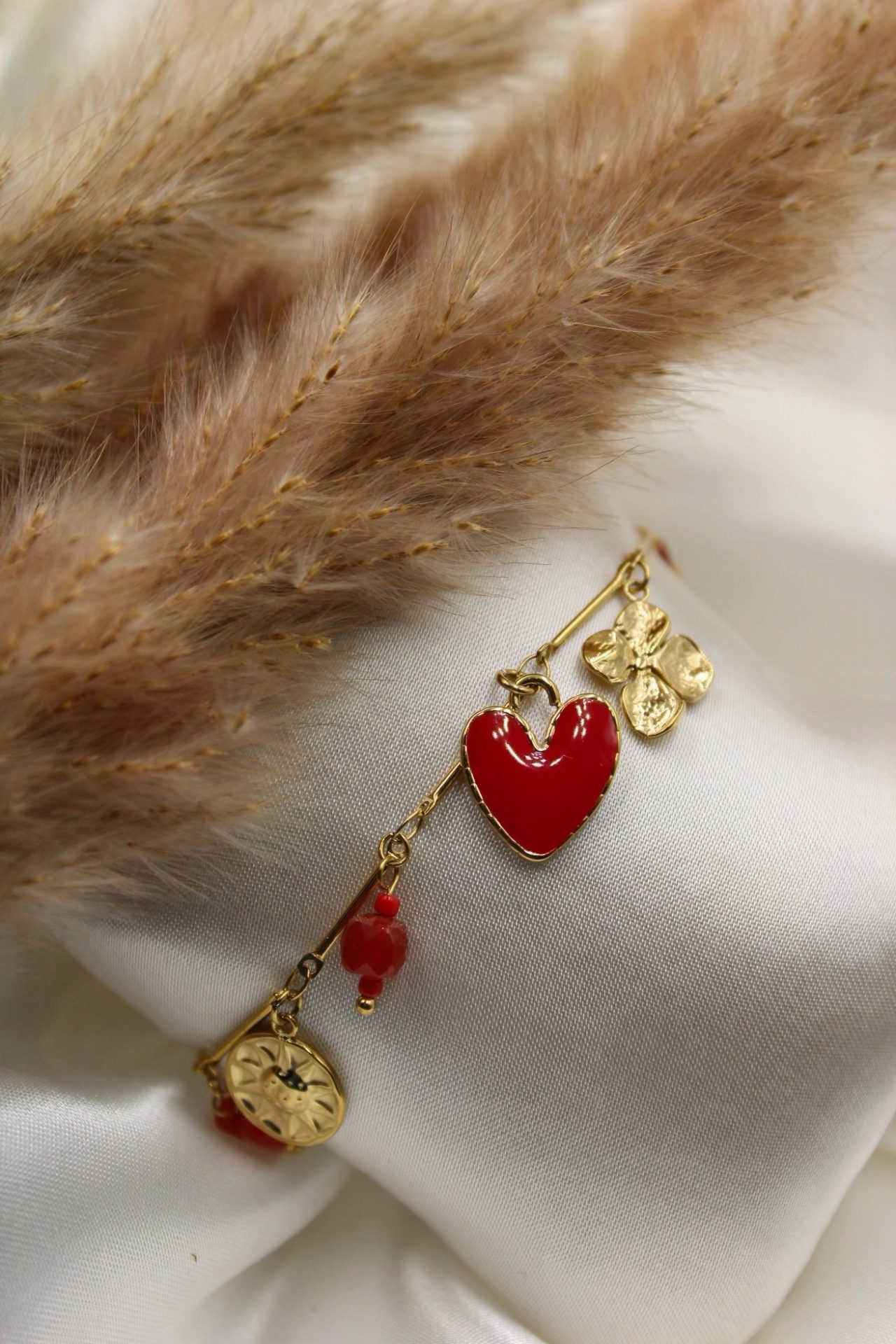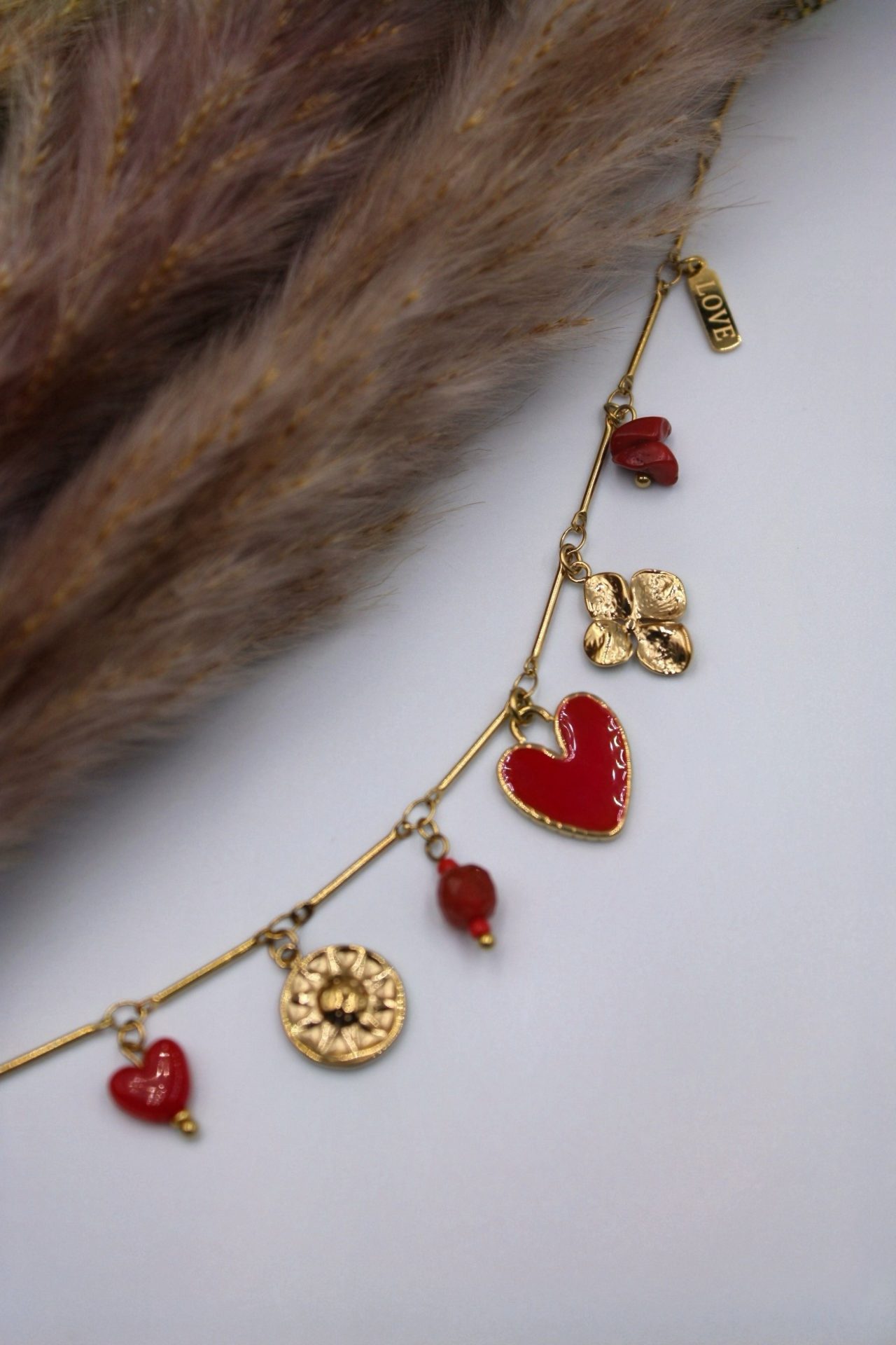 Ce bracelet délicat et féminin est une véritable ode à l’amour. Sa chaîne dorée est sublimée par une série de breloques charmantes : un cœur rouge émaillé, une fleur dorée, de petits cœurs rouges et une perle rouge corail. Chaque détail a été soigneusement choisi pour créer un bijou unique et plein de charme. Le pendentif « LOVE » ajoute une touche finale parfaite.