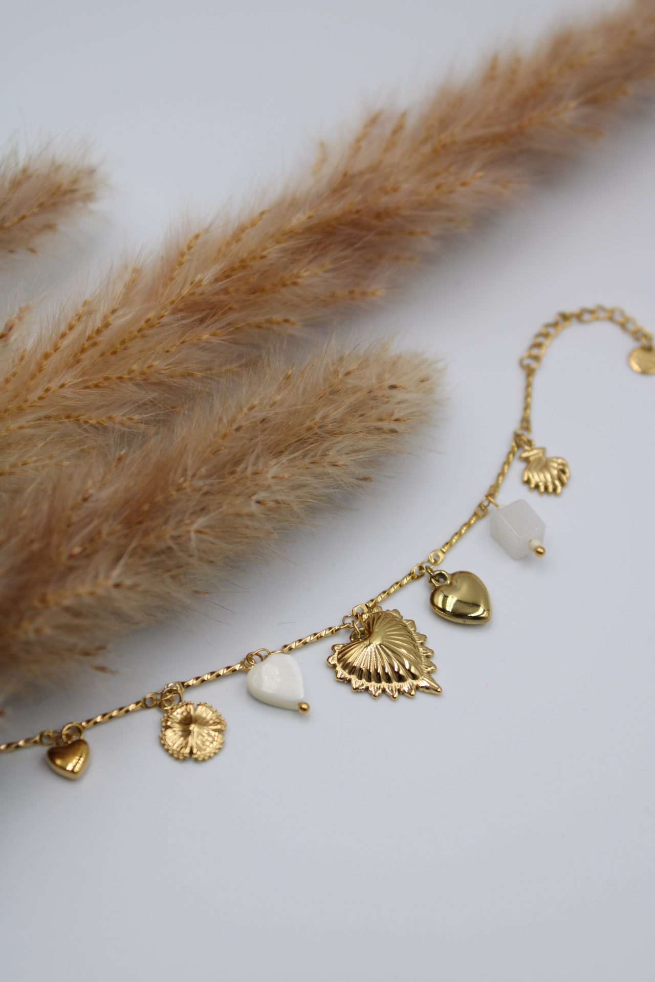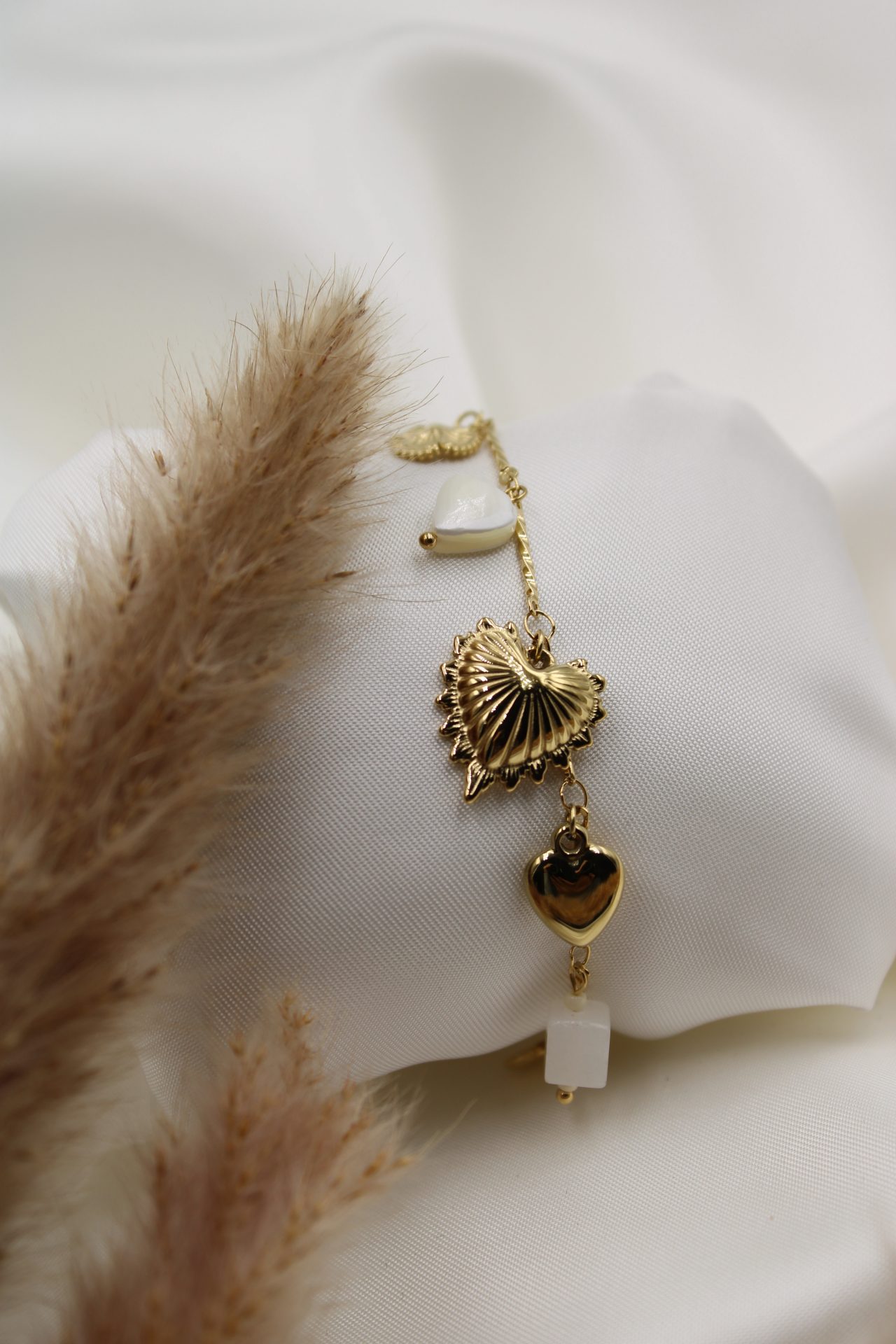 Découvrez notre bracelet, une pièce unique qui allie élégance et symbolisme. Fabriqué en chaîne dorée, il est orné de charms enchanteurs : deux cœurs dorés qui symbolisent l’amour, une délicate fleur représentant la beauté, ainsi qu’une pierre en forme de cœur et un cube en pierre blanche qui ajoutent une touche de sophistication. Chaque détail a été soigneusement conçu pour créer un bijou qui raconte une histoire. Que ce soit pour une occasion spéciale ou pour illuminer votre quotidien, ce bracelet est l’accessoire parfait pour exprimer votre style et vos émotions.
