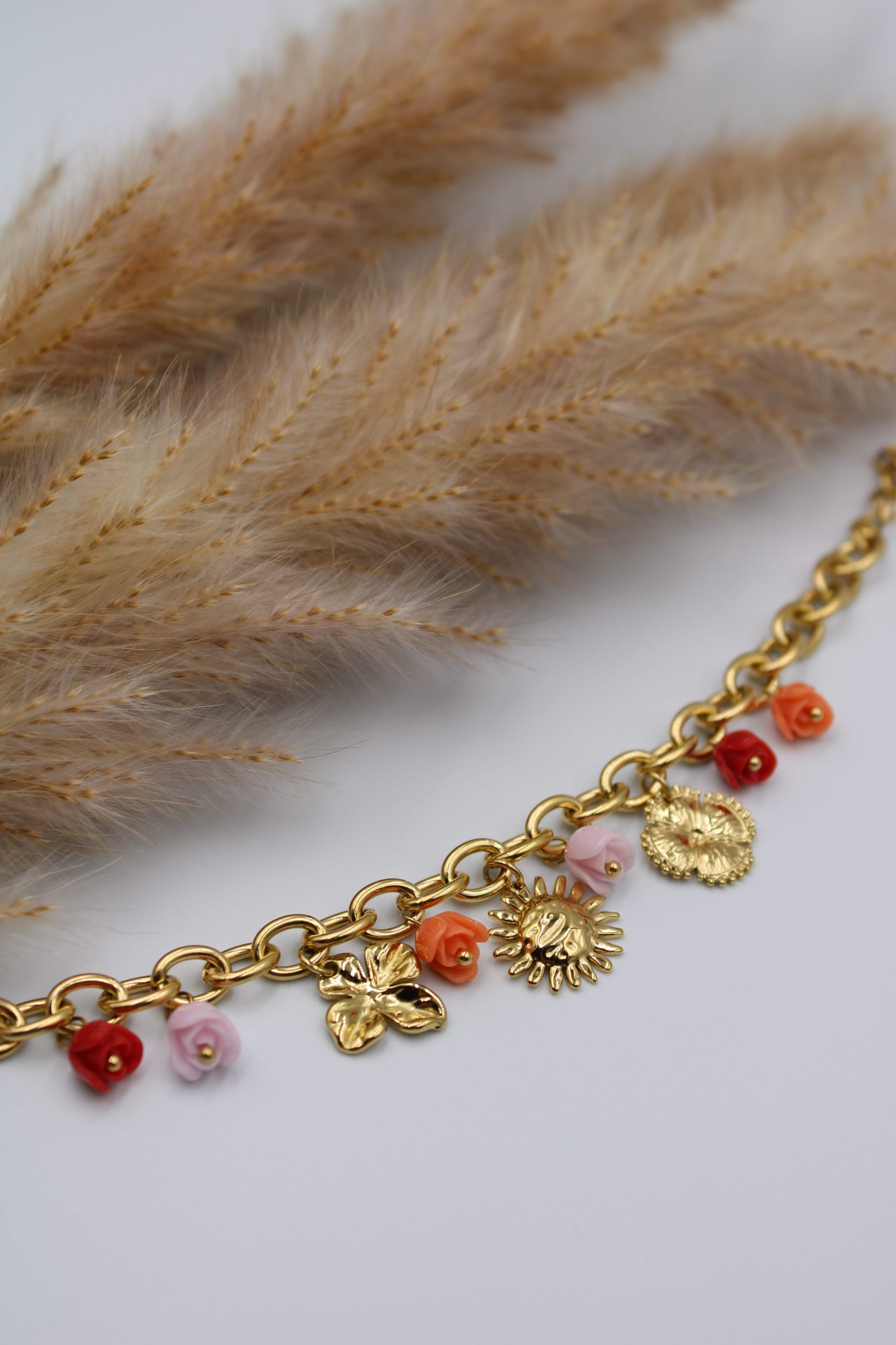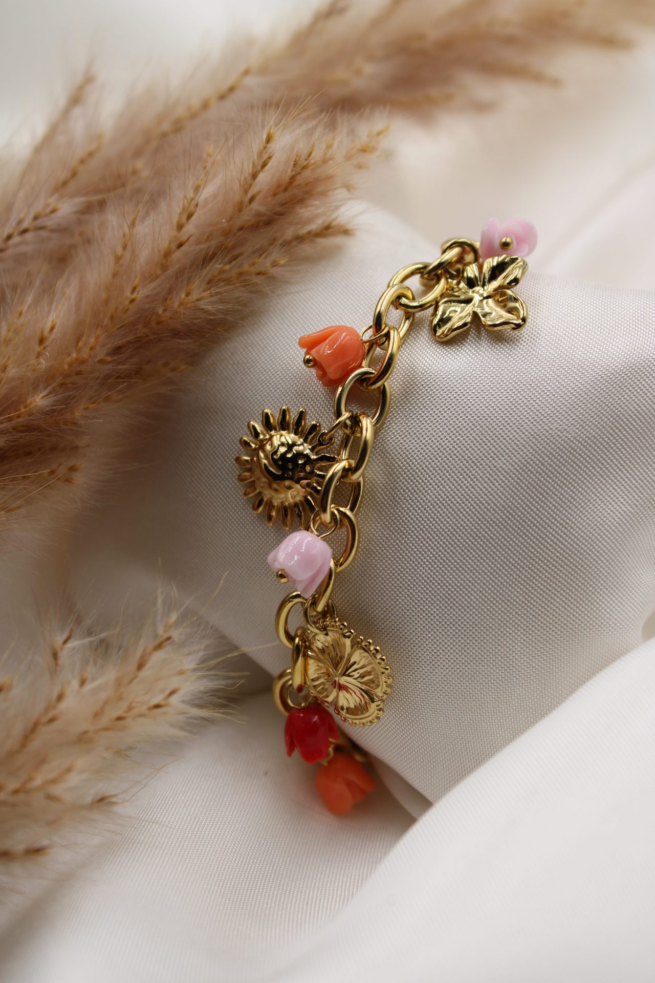 Mettez en valeur votre poignet avec ce bracelet doré, une petite merveille de détails. Admirez le soleil éclatant, symbole de lumière et de chaleur, et la multitude de petites roses et fleurs colorées, évoquant un jardin luxuriant. L’éclat doré du bracelet ajoute une touche d’élégance intemporelle. Ce bijou est une ode à la nature et à la beauté.