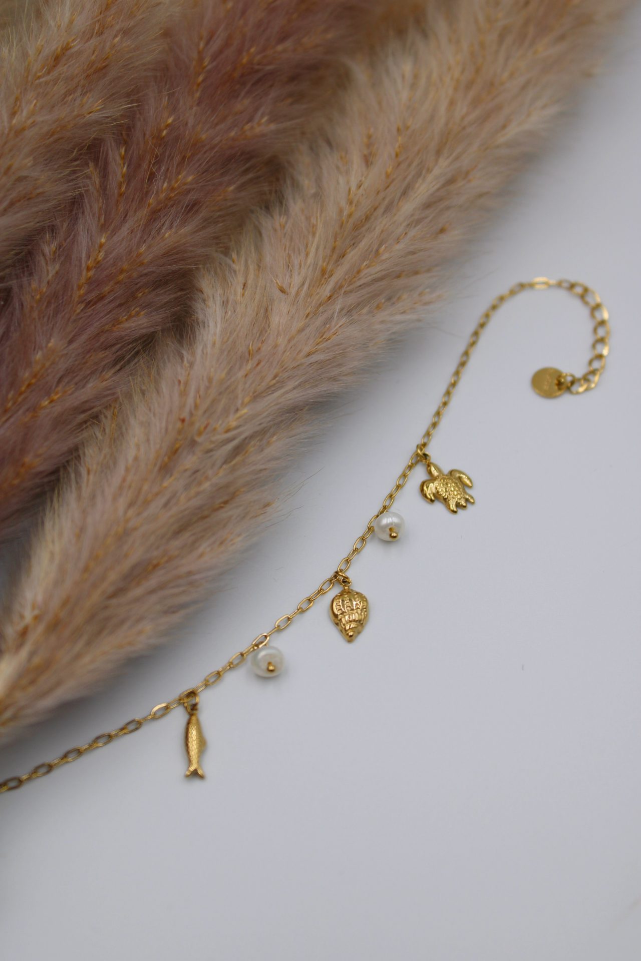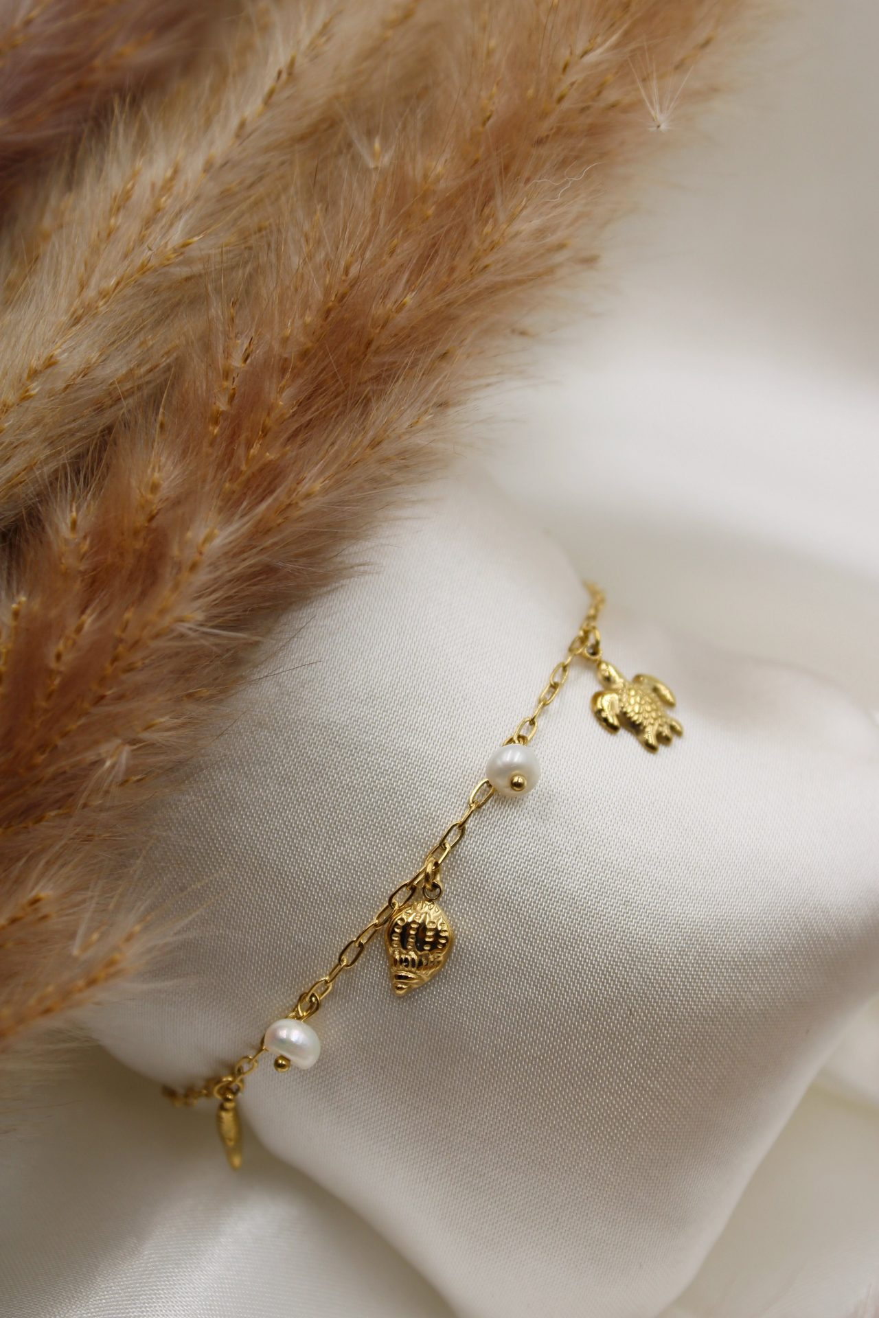 Succombez au charme de notre bracelet, une pièce unique qui capturera tous les regards! Ce bijou raffiné est composé d’une délicate chaîne en or, sublimée par des breloques évoquant les merveilles de l’océan : un joli poisson qui danse avec les vagues, une coquille délicate qui rappelle les plages ensoleillées, et une tortue symbolisant sagesse et longévité. Les perles nacrées ajoutent une touche d’élégance intemporelle, faisant de ce bracelet un accessoire parfait pour sublimer vos tenues estivales ou apporter une note beachy chic à votre garde-robe toute l’année.