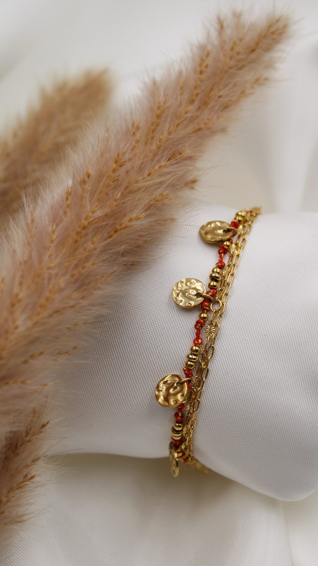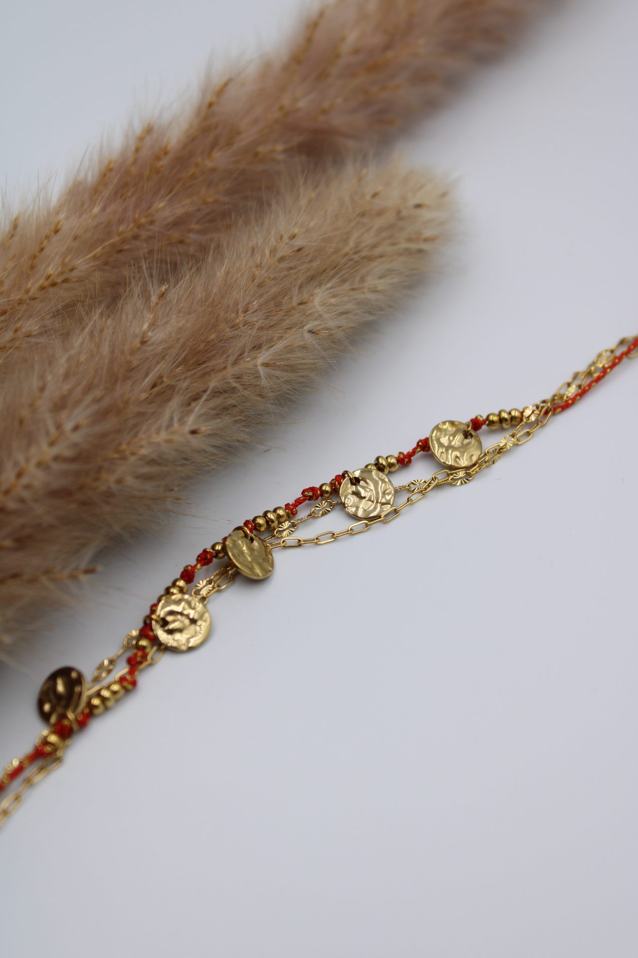 Laissez-vous séduire par l’élégance intemporelle de ce bracelet bohème, qui ajoute une touche de chic à chaque poignet. Confectionné avec une fine chaîne dorée, il est délicatement agrémenté d’un fil rouge vibrant, orné de perles dorées et de médaillons dorés martelés, créant une harmonie parfaite entre raffinement et modernité.