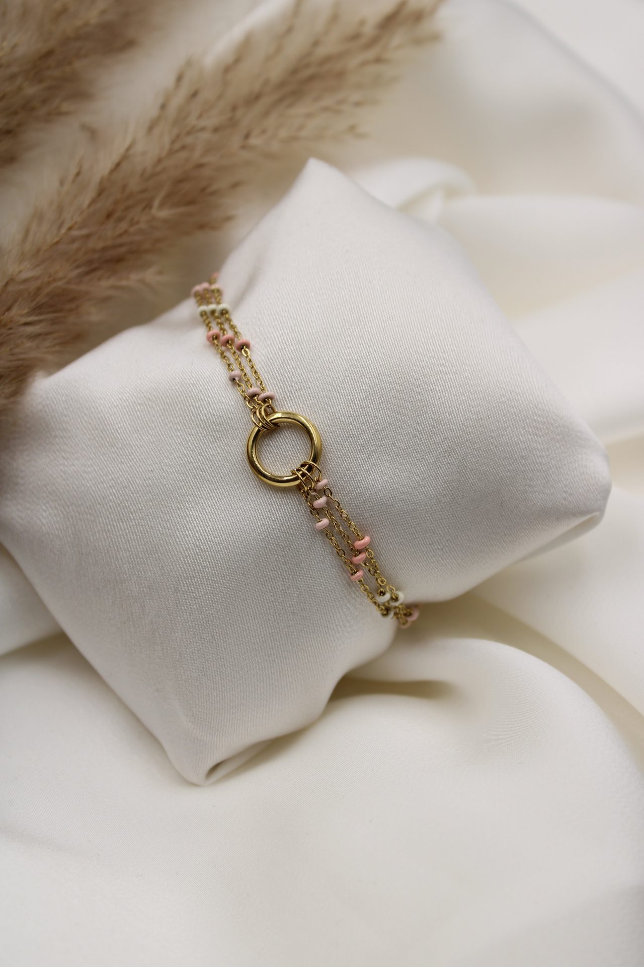 Ce bracelet délicat en chaîne dorée est orné de petites perles roses et d’un anneau central élégant. Une création subtile qui évoque la douceur et l’harmonie, parfaite pour ajouter une touche de raffinement discret à votre poignet.