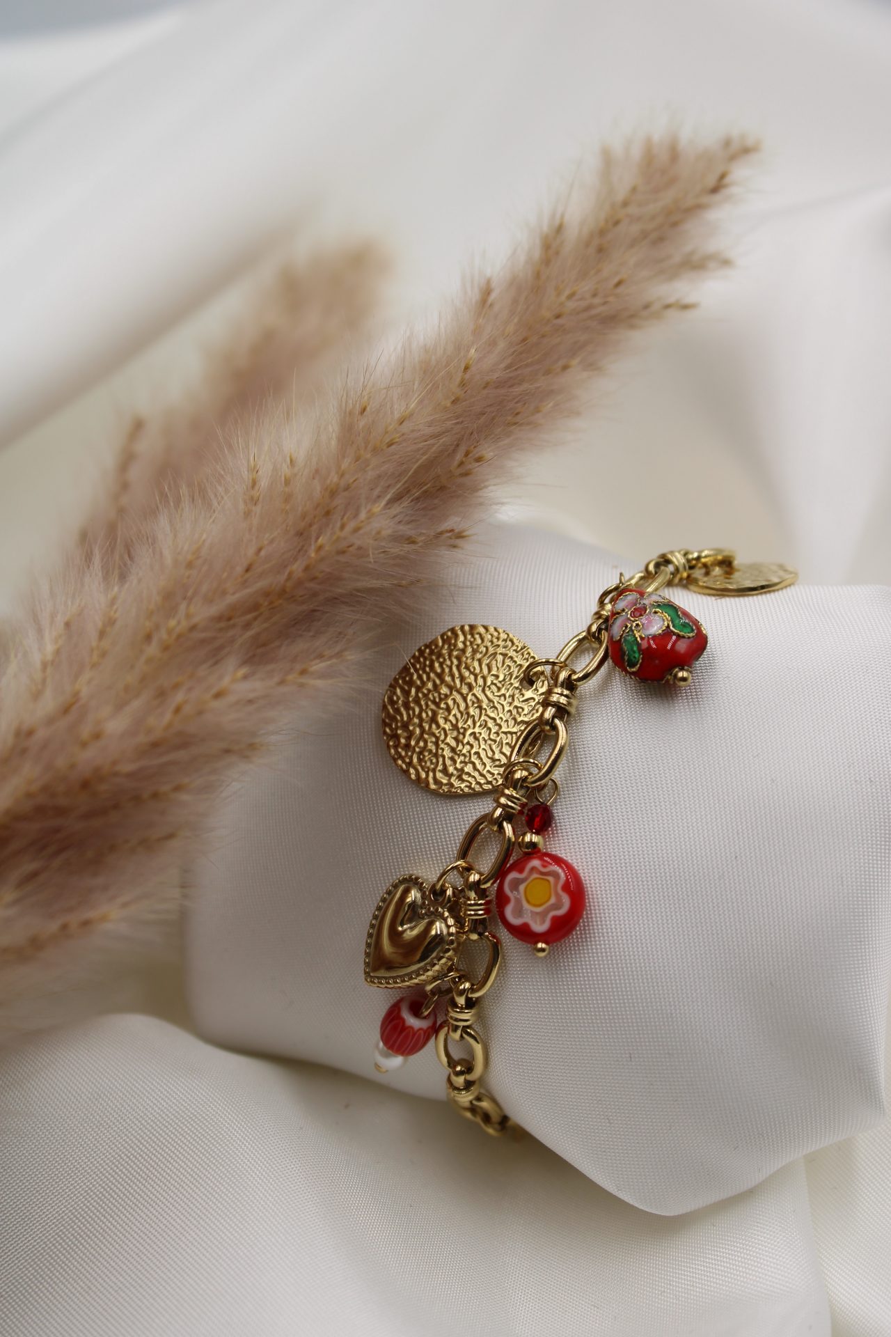 Apportez une touche de couleur et de fantaisie à votre poignet avec ce bracelet chaîne dorée orné de charmes rouges. Des médaillons dorés texturés, des perles rouges vibrantes avec de délicates fleurs blanches, une perle nacrée, un petit cœur doré et une perle rouge striée se combinent pour créer un bijou unique et captivant. Ce bracelet est parfait pour ajouter une touche de gaieté et de sophistication à n’importe quelle tenue.