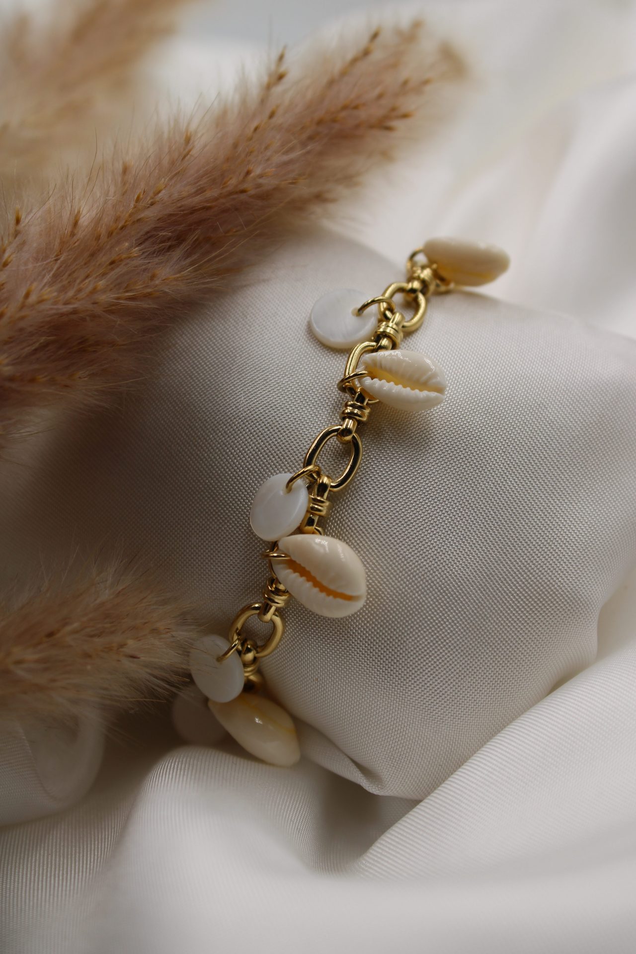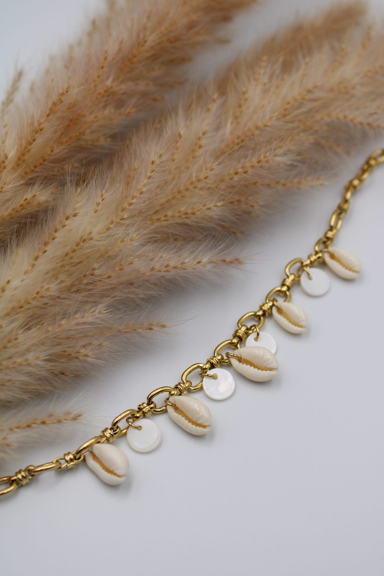 Ce bracelet délicat et élégant est composé d’une chaîne dorée en métal, ornée de coquillages blancs naturels et de cercles nacrées. Le contraste entre le doré et le blanc cassé crée un look bohème chic parfait pour l’été. Idéal pour ajouter une touche de charme à vos tenues estivales, il apportera une note à la fois sophistiquée et décontractée à vos poignets.