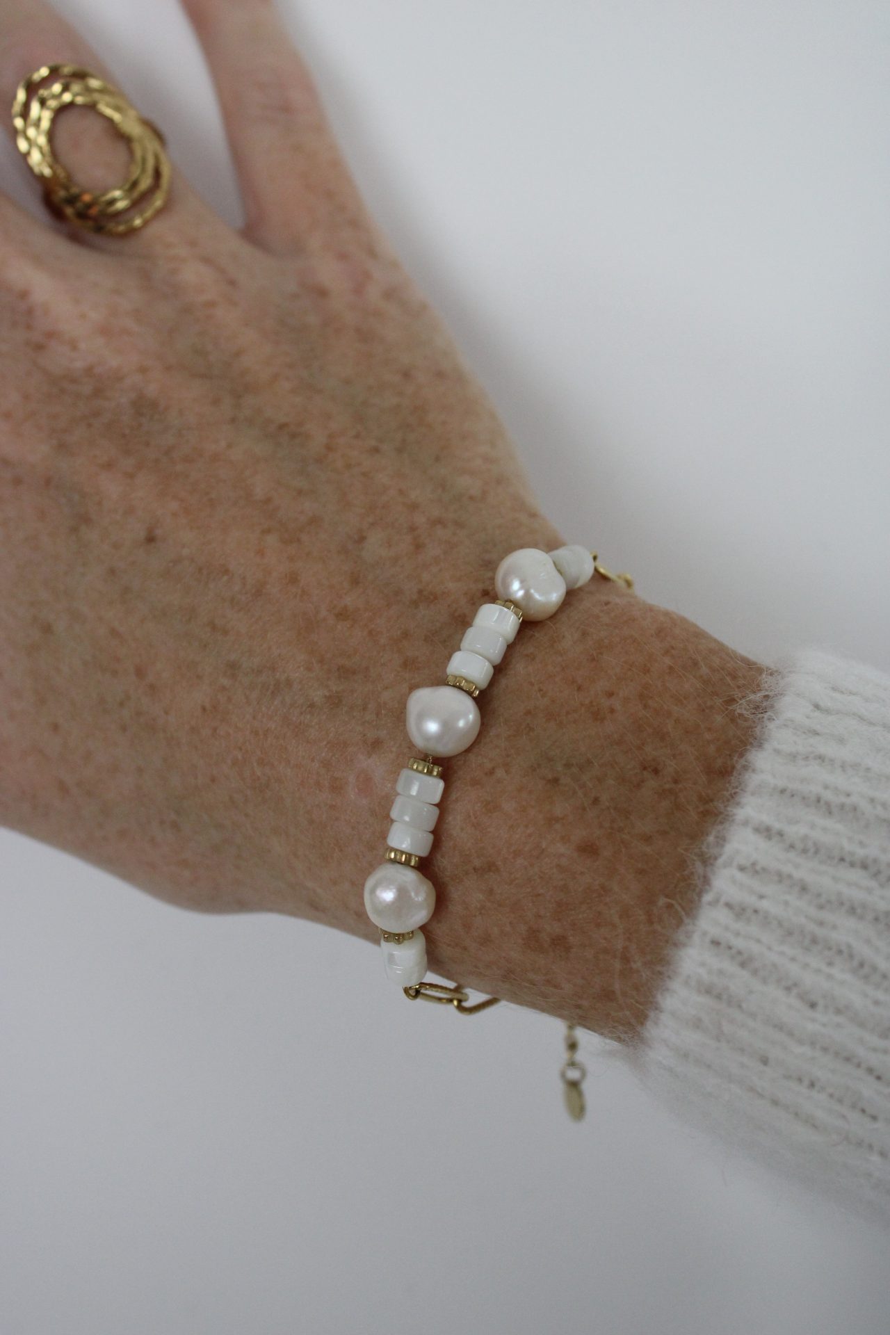 Le mix entre la maille dorée et les perles nacrées apporte une touche d’originalité et de féminité à votre poignet.