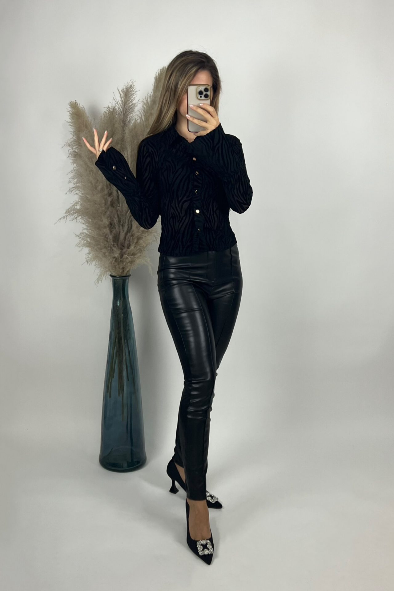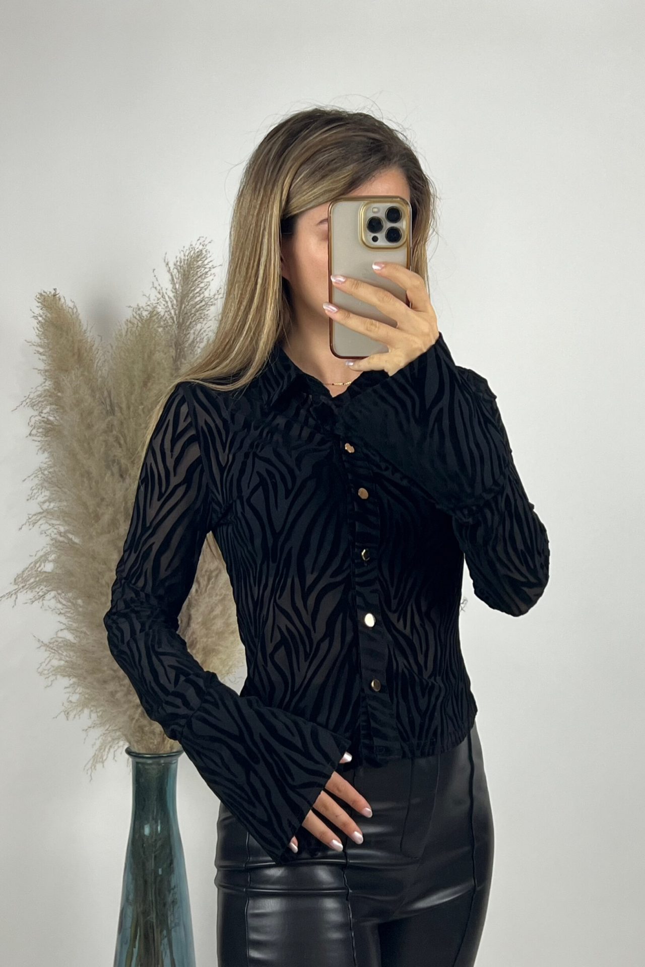 In love de cette chemise ! Avec sa couleur noire et sa matière légèrement transparente, elle fait un sans-faute. On aime la porter de jour comme de nuit pour un look inoubliable. Simple et très efficace !