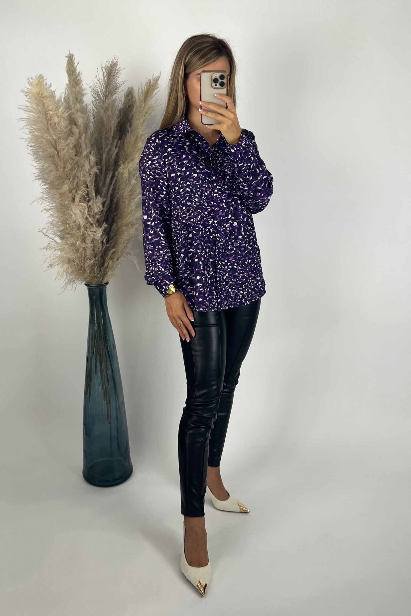 Divine dans cette chemise ! On adore sa matière satinée très classe et son imprimé et son style structuré qui fait toute la différence. Très tendance pour cet automne-hiver, le violet fait des merveilles, il illumine la silhouette.