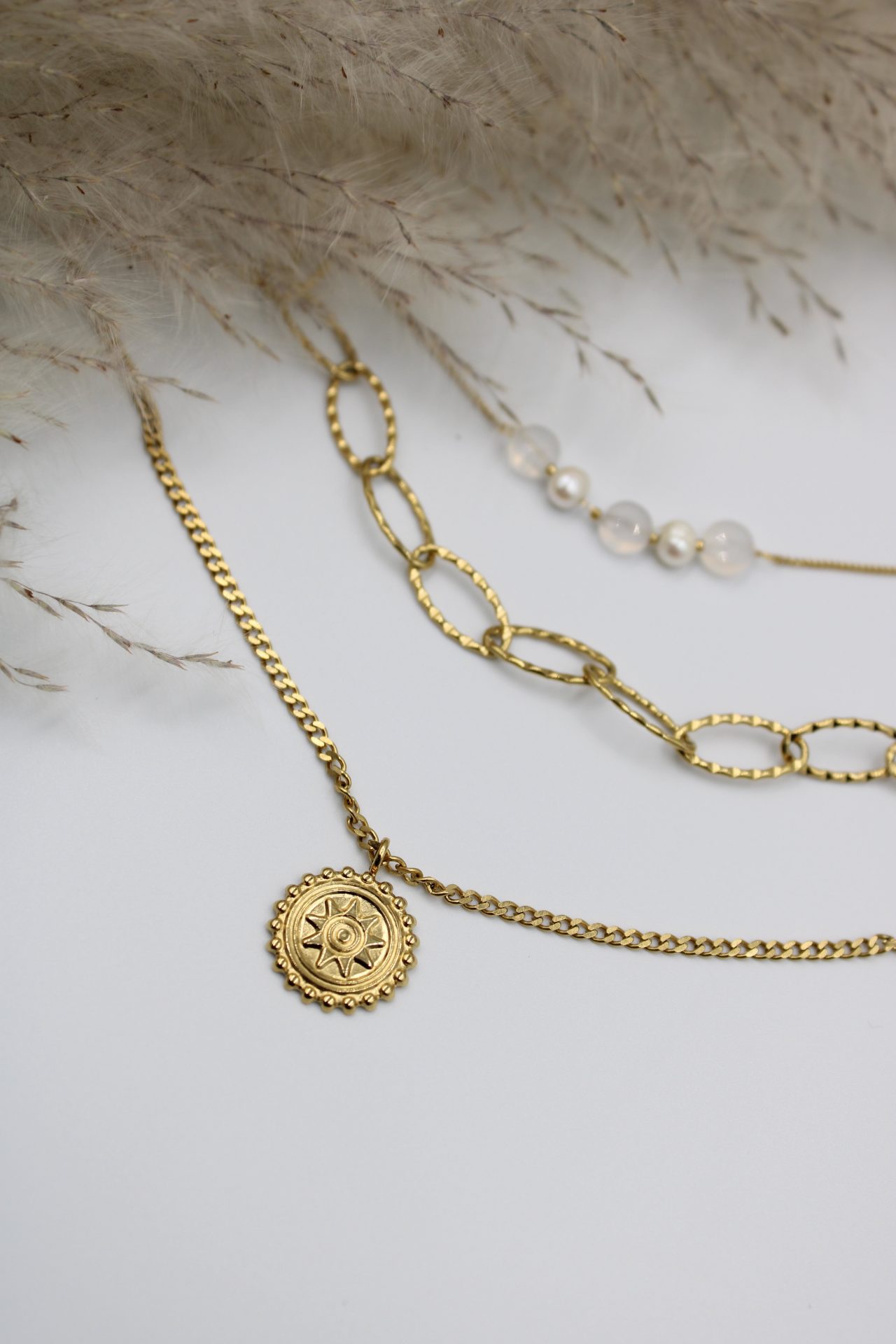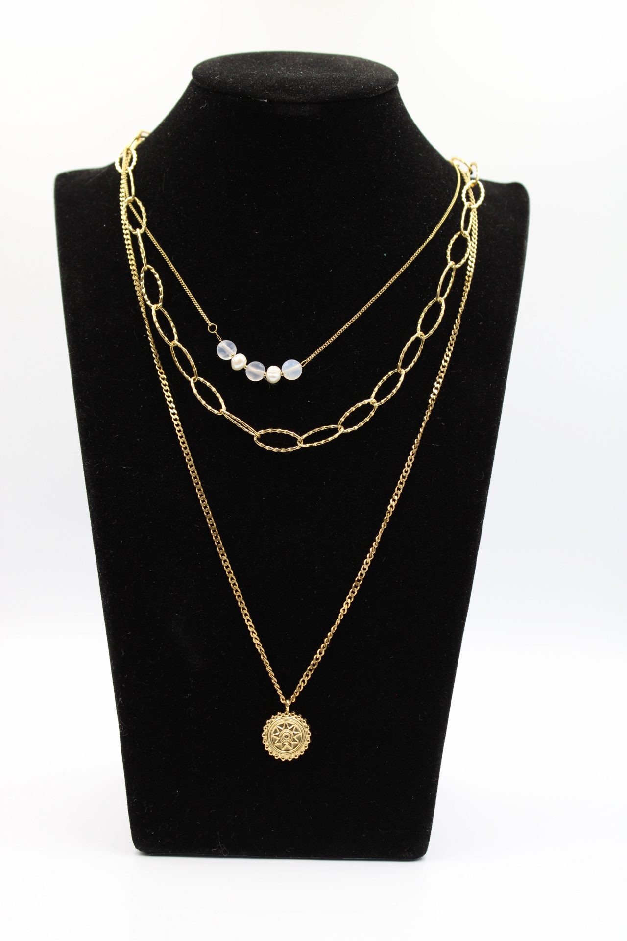 Composé de trois chaînes en acier inoxydable. Ses perles disposées au centre ajoutent à la fois une touche d’audace et de délicatesse à ce bijou. Vous l’aurez compris, il mettra parfaitement en valeur votre décolleté !