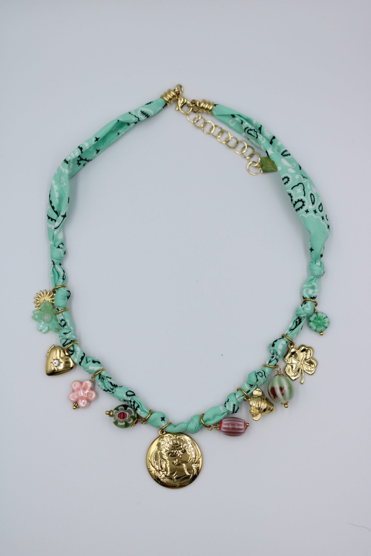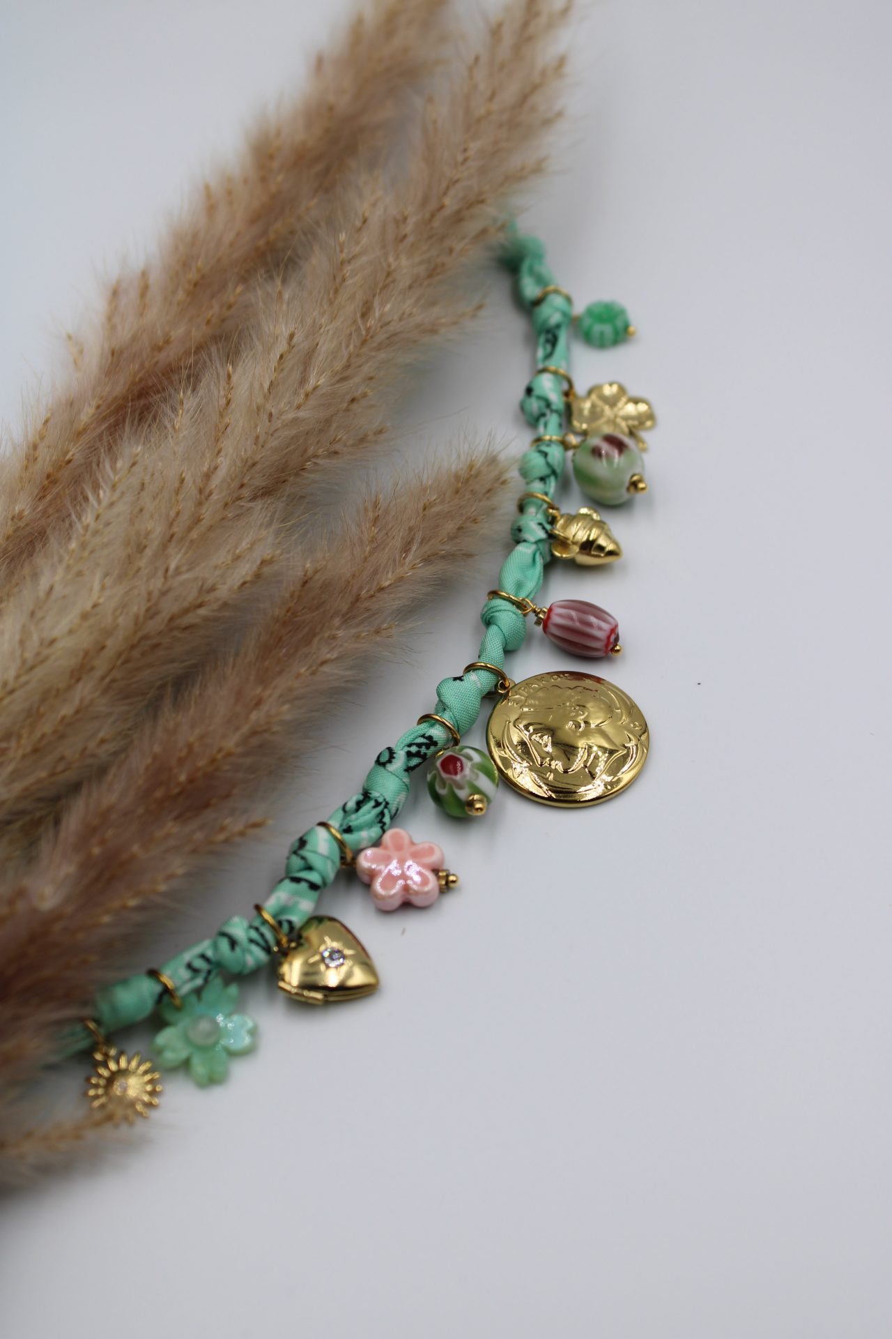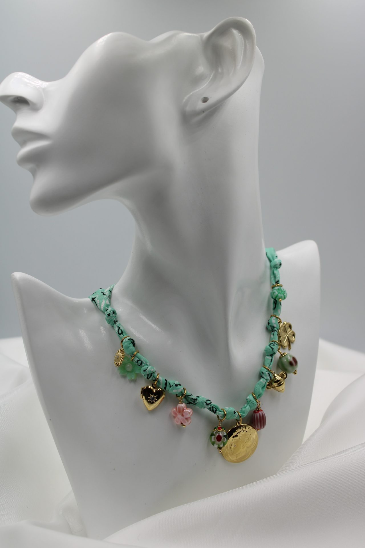 Découvrez notre collier en tissu vert menthe, une pièce unique qui apporte une touche de fraîcheur à votre collection de bijoux. Fabriqué à partir d’un tissu doux avec un motif inspiré des bandanas, ce collier est orné de charms dorés, notamment une pièce de monnaie, un cœur, une fleur, un trèfle, un soleil et une abeille.Chaque détail a été soigneusement conçu pour créer un bijou à la fois léger et plein de charme. Que ce soit pour illuminer une tenue quotidienne ou pour ajouter une note de gaieté à une occasion spéciale, ce collier saura vous séduire.
