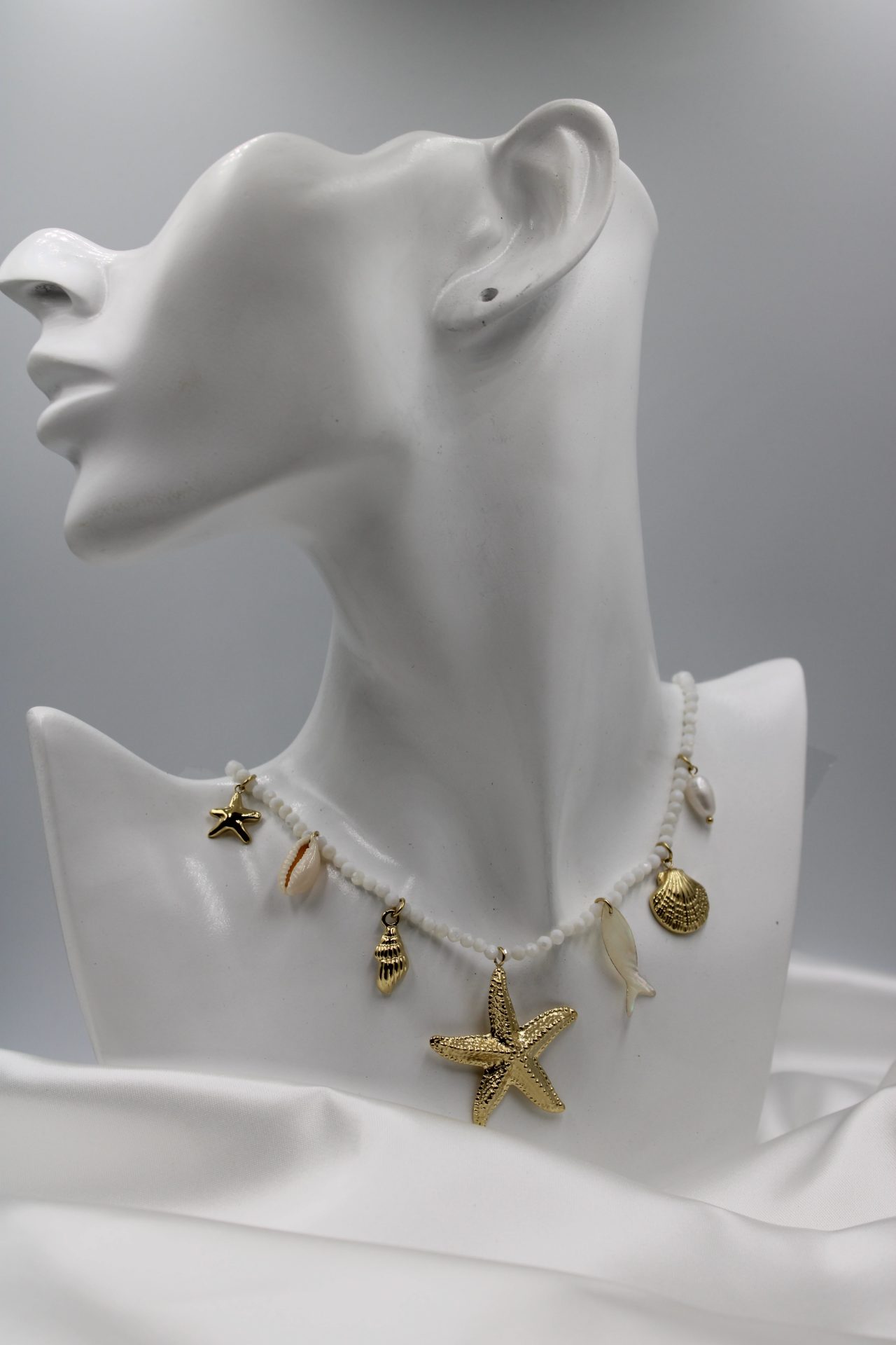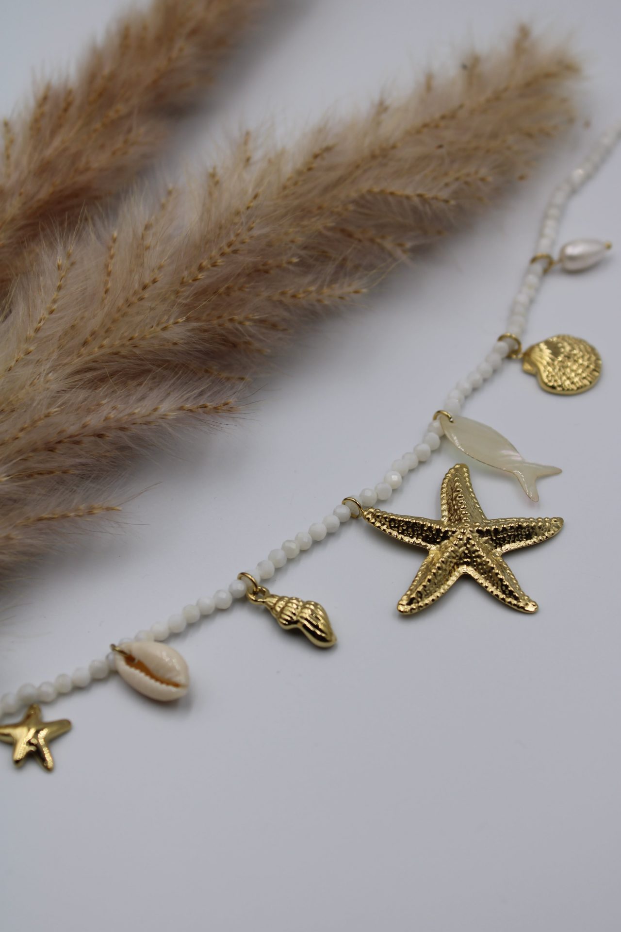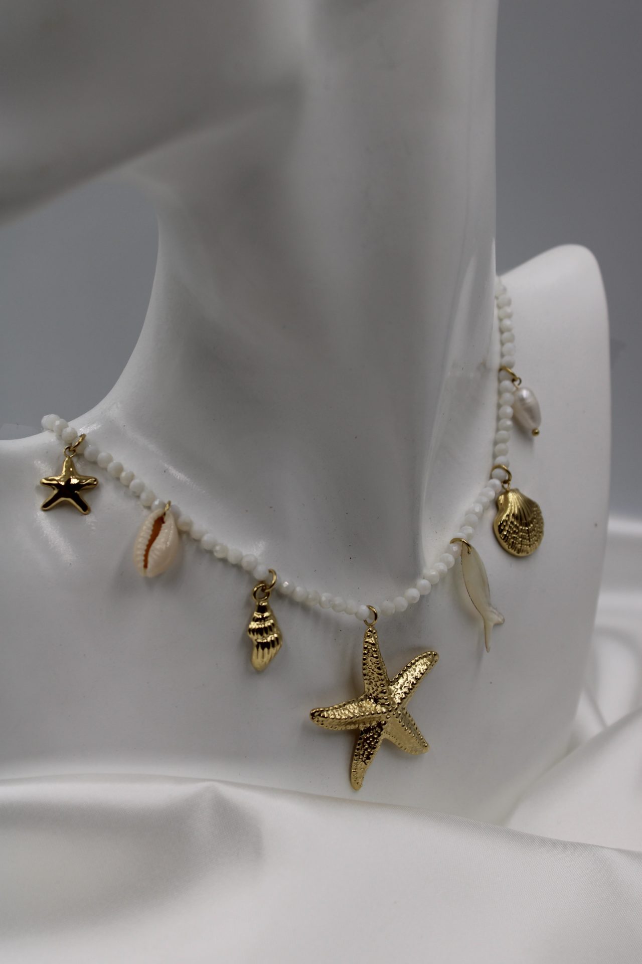 Plongez dans l’élégance estivale avec notre collier . Ce bijou délicat est composé d’une chaîne de perles blanches nacrées, rehaussée de breloques en forme d’étoiles de mer, de coquillages et d’un petit poisson, tous en métal doré. Un accessoire parfait pour ajouter une touche de charme maritime à toutes vos tenues. Idéal pour les occasions spéciales ou pour un look quotidien plein de style.