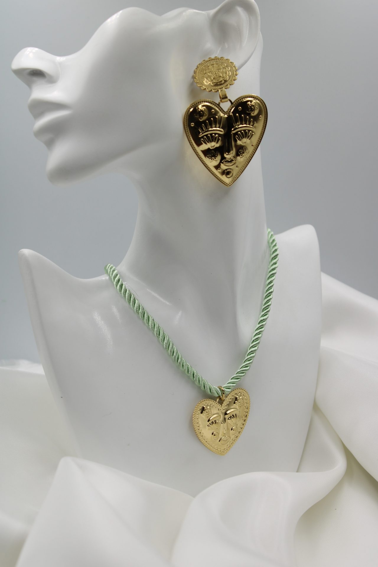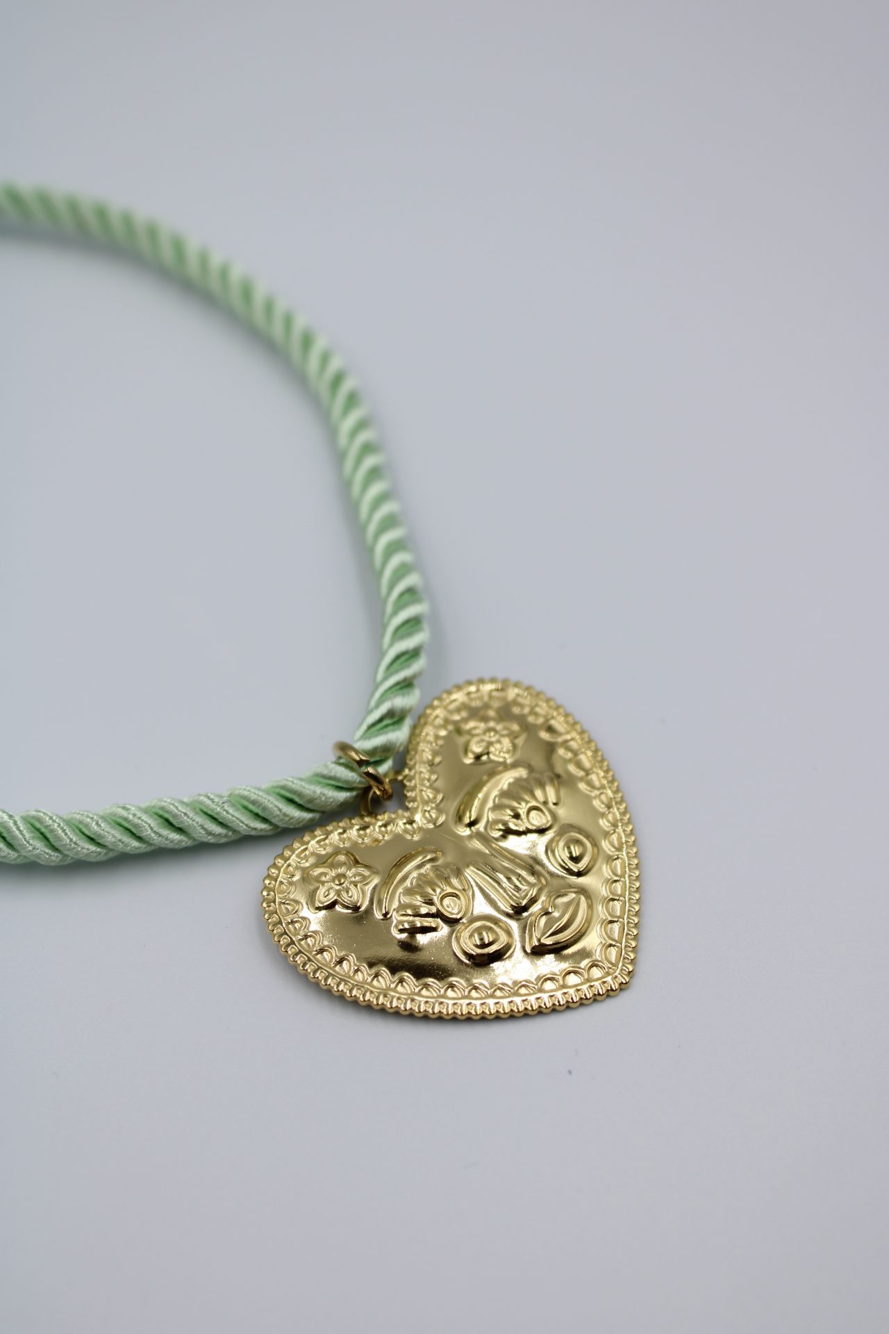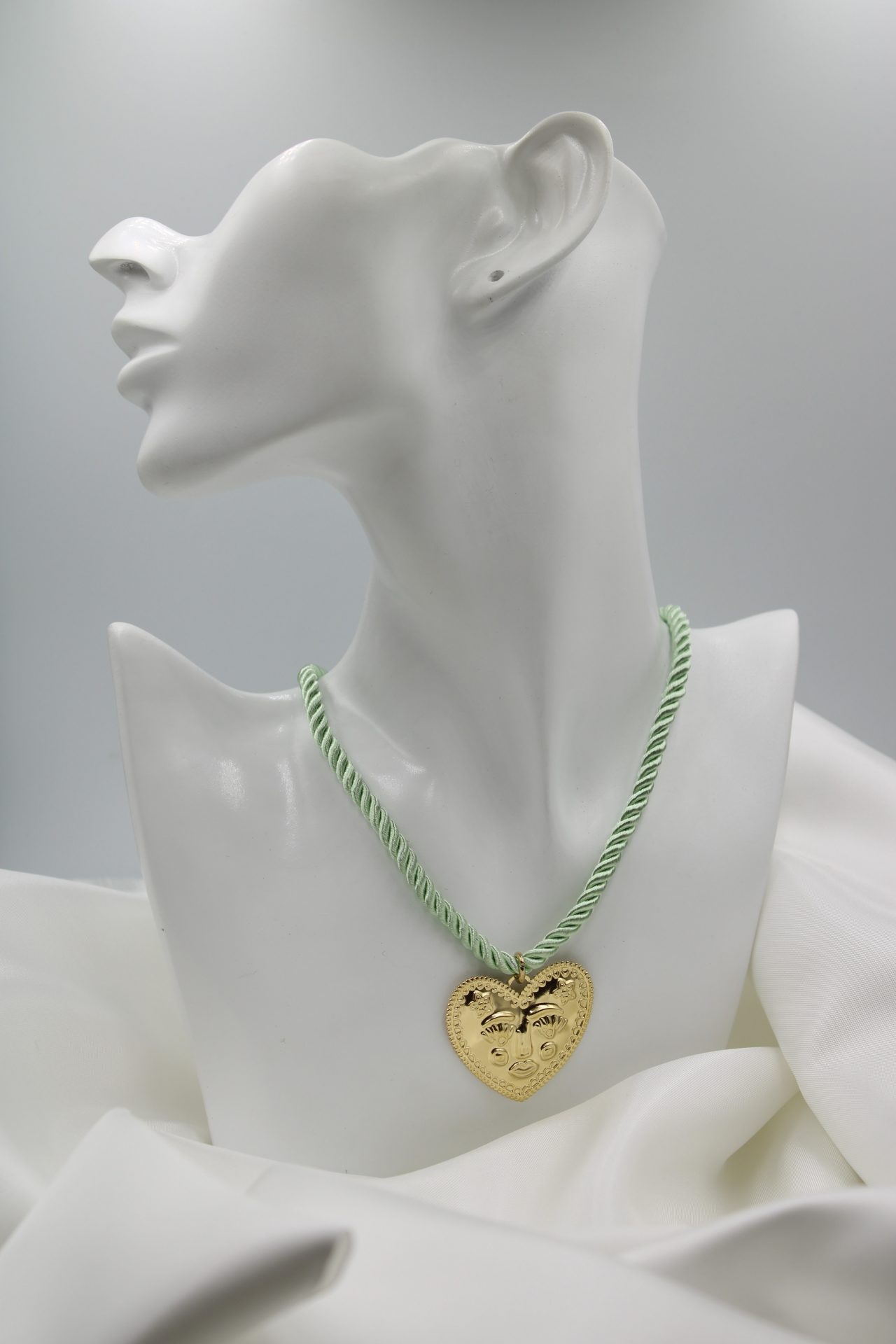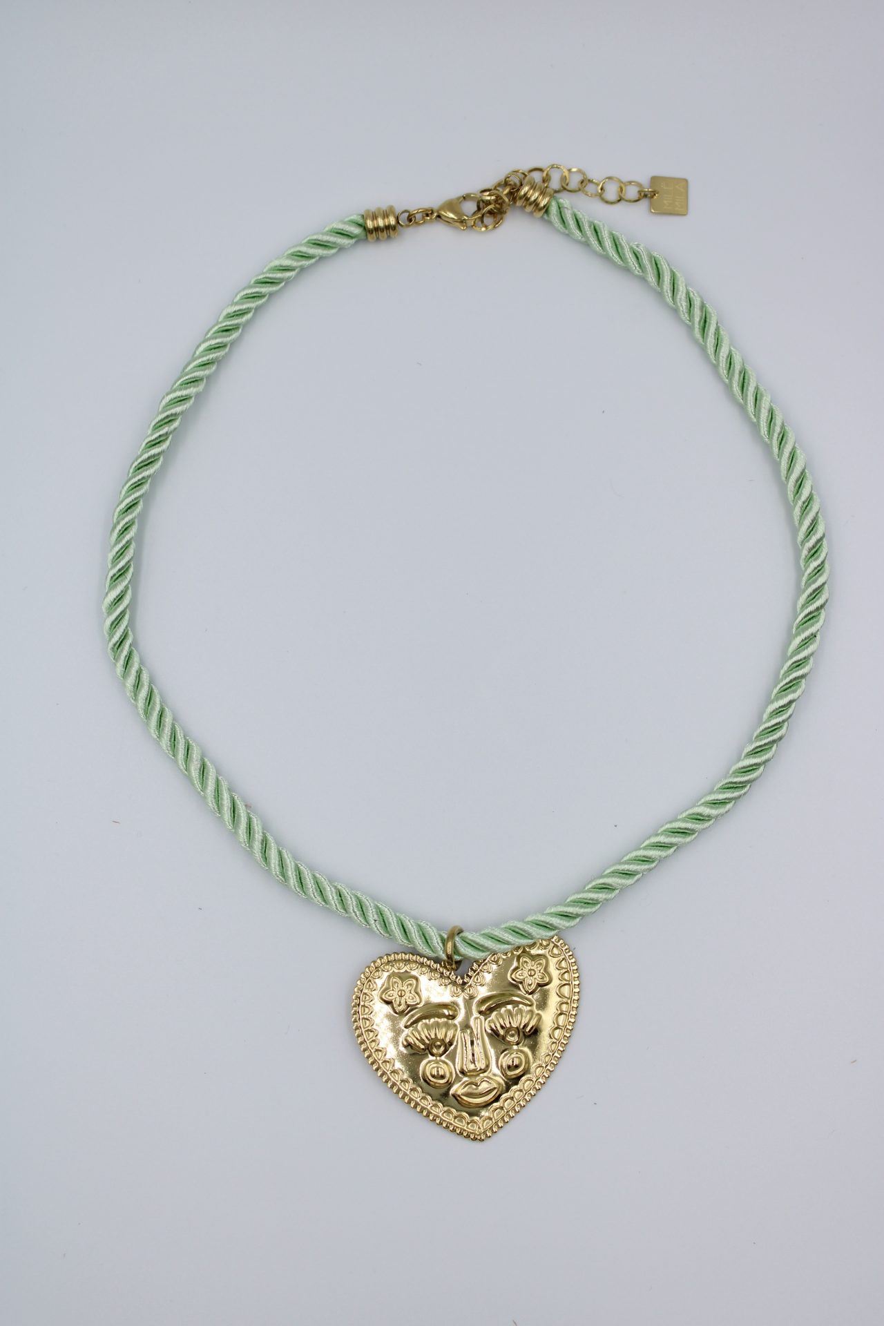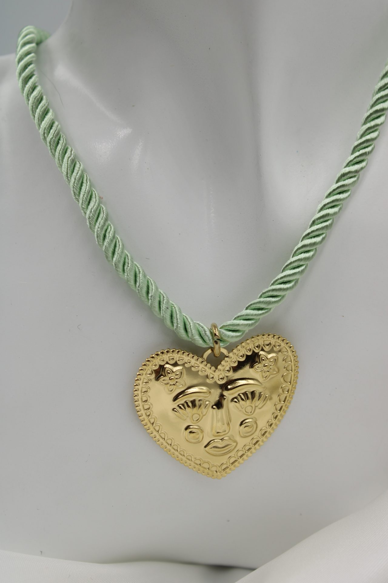 Découvrez notre collier , une pièce unique qui allie modernité et originalité. Fabriqué avec un cordon tressé de couleur vert d’eau, il est orné d’un pendentif en forme de cœur qui présente un visage délicatement embossé. Les détails des yeux, des cils et de la bouche ajoutent une touche élégante à ce bijou. Parfait pour apporter une note de fraîcheur à vos tenues, ce collier est idéal pour exprimer votre personnalité avec style.