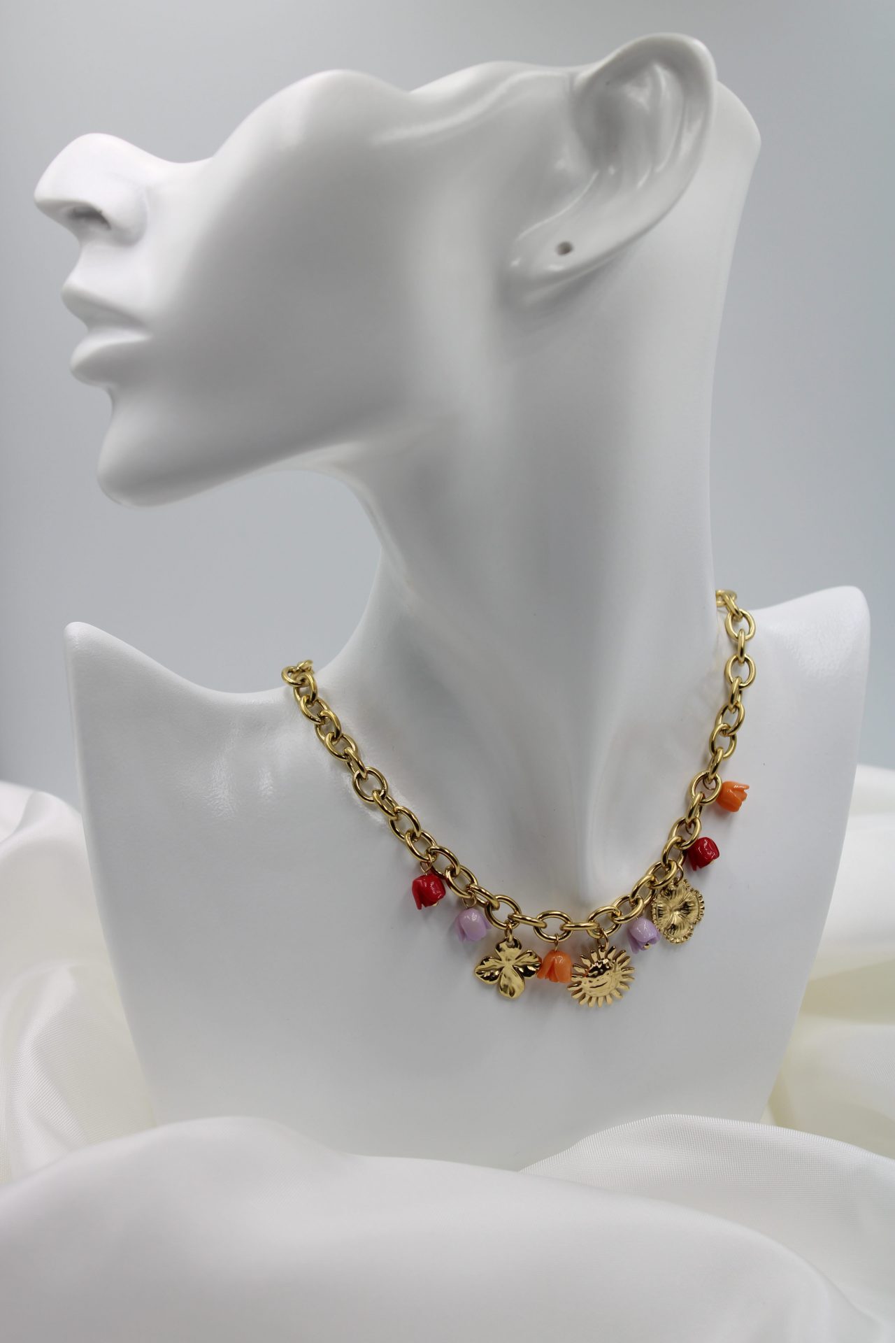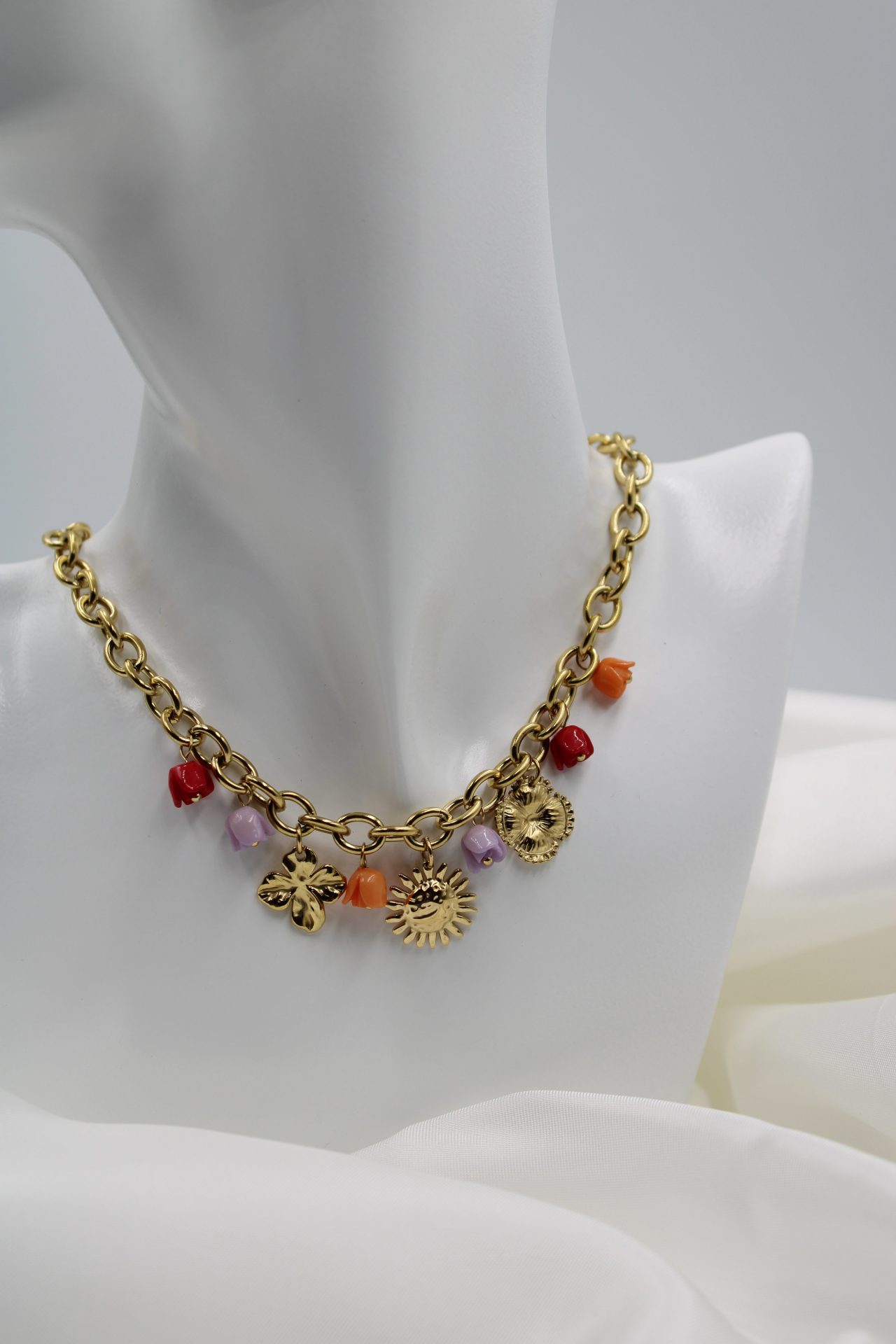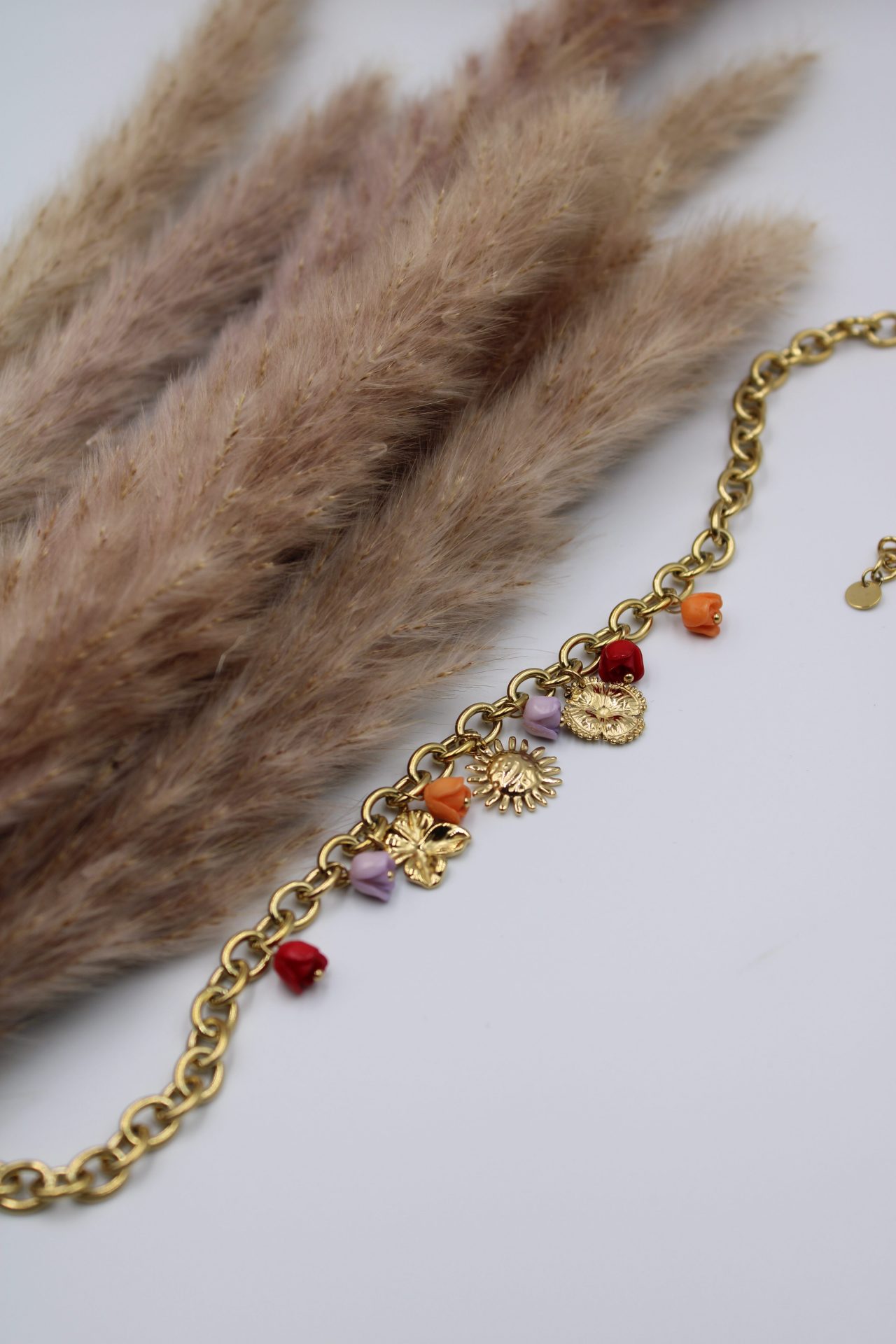 Mettez en valeur votre cou avec ce collier doré, une petite merveille de détails. Admirez le soleil éclatant, symbole de lumière et de chaleur, et la multitude de petites roses et fleurs colorées, évoquant un jardin luxuriant. L’éclat doré du bracelet ajoute une touche d’élégance intemporelle. Ce bijou est une ode à la nature et à la beauté.