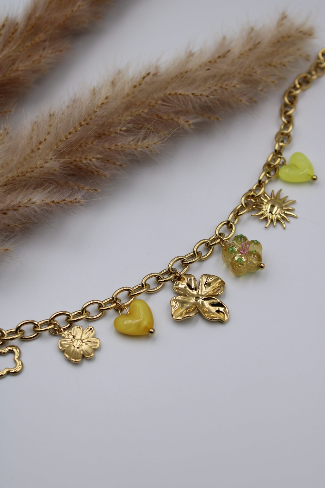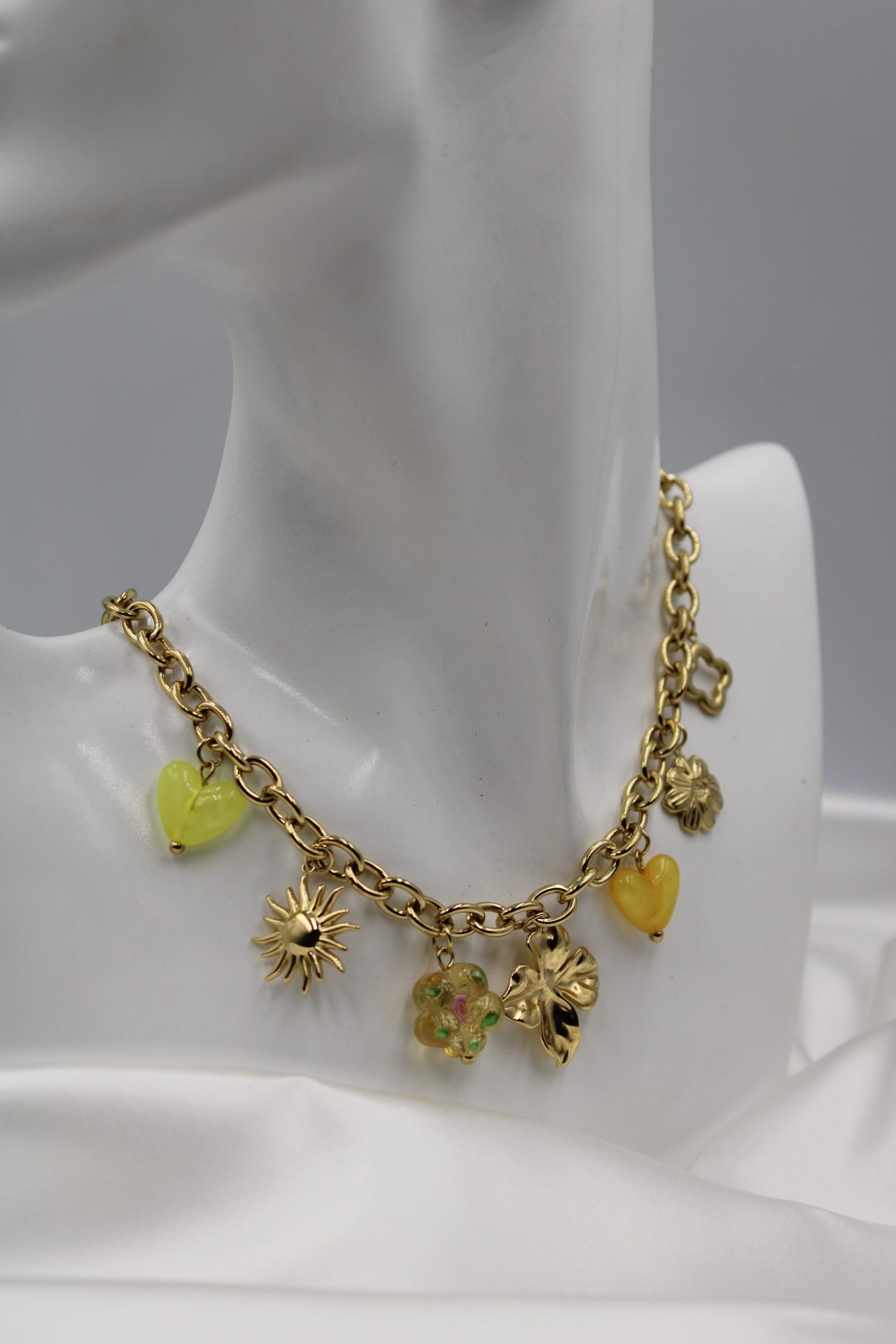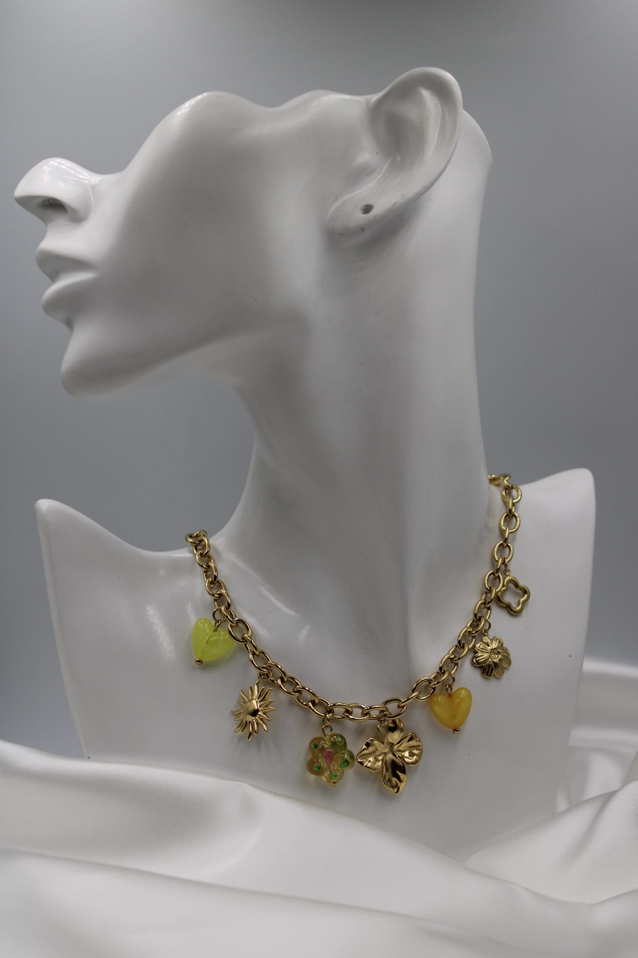 Ce collier élégant et féminin est composé d’une chaîne dorée et ornée de plusieurs breloques charmantes. On y retrouve des motifs floraux, un soleil, un cœur et des perles de verre vert pâle, apportant une touche de fraîcheur et de luminosité. Parfait pour ajouter une note bohème-chic à votre look, ce collier est un accessoire polyvalent qui se portera aussi bien au quotidien que pour une occasion spéciale.