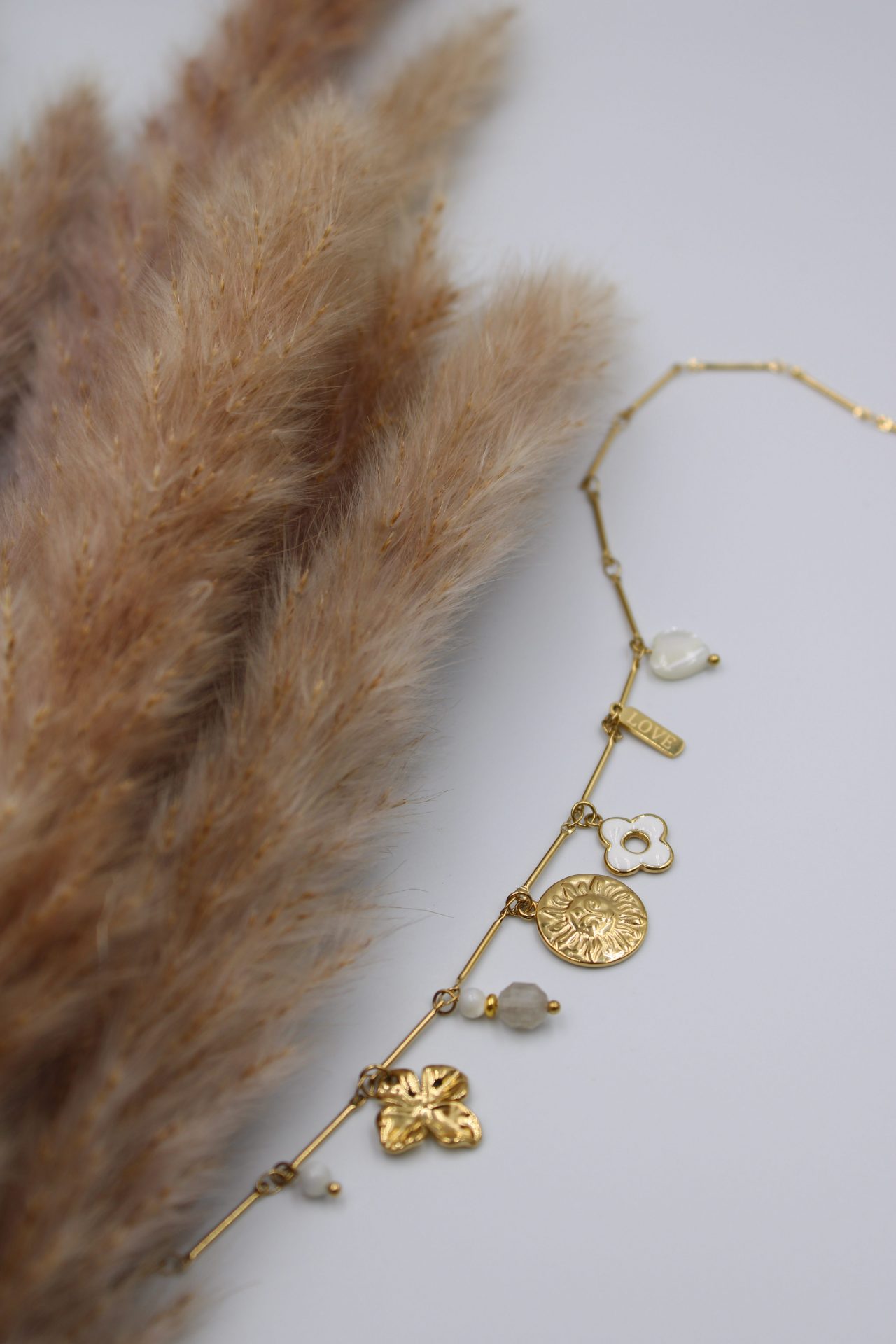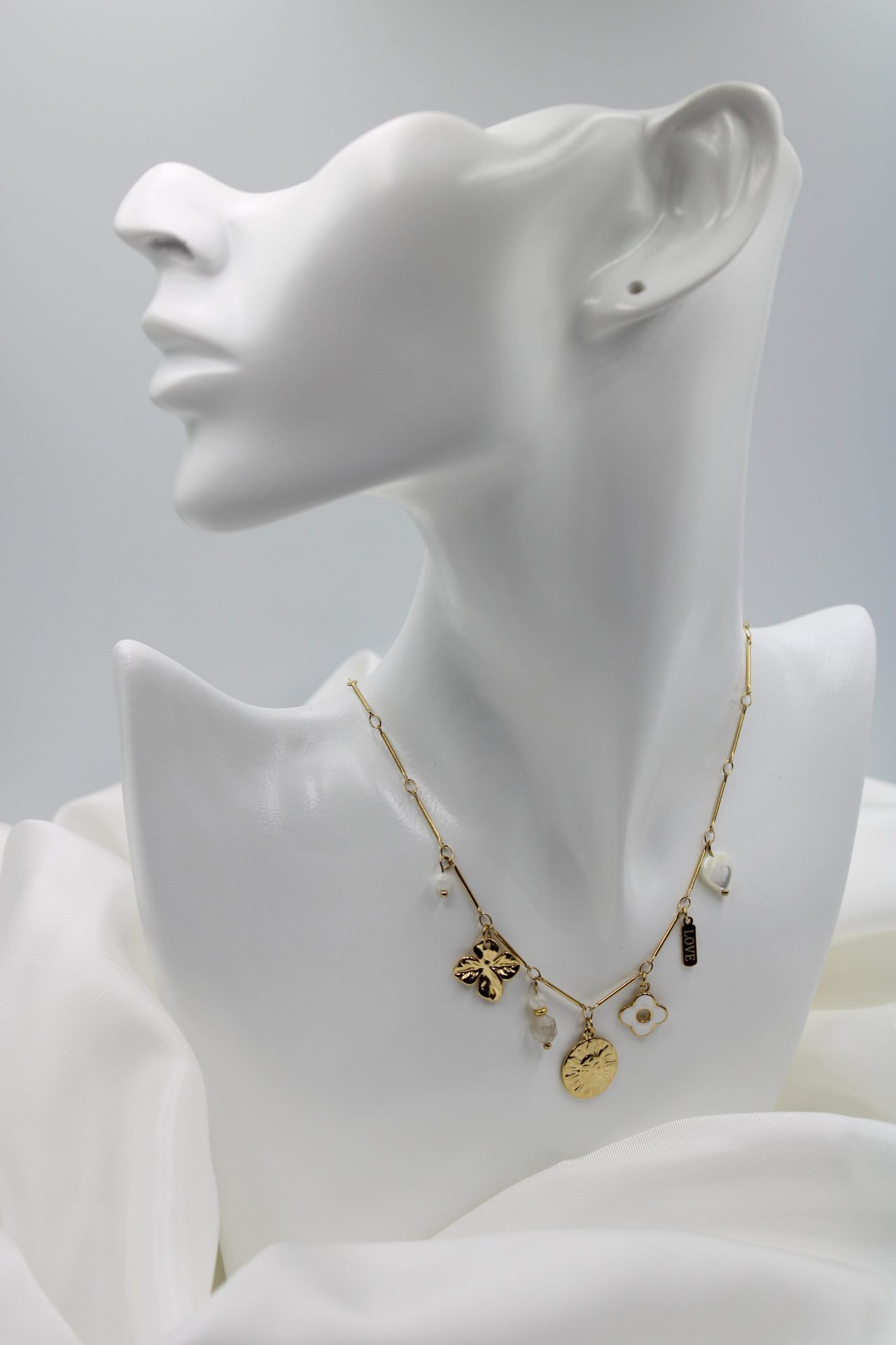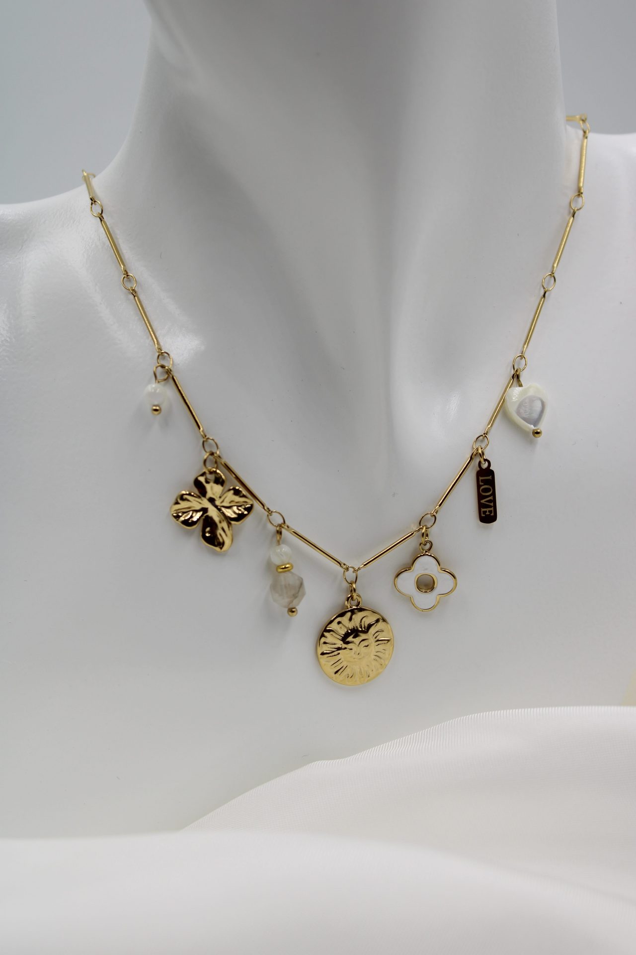 Succombez à la magie de ce collier , une pièce radieuse qui évoque la chaleur du soleil et les douceurs de l’amour. Ce bijou délicat, orné de pendants scintillants, capte la lumière pour créer une aura enchanteresse autour de vous.