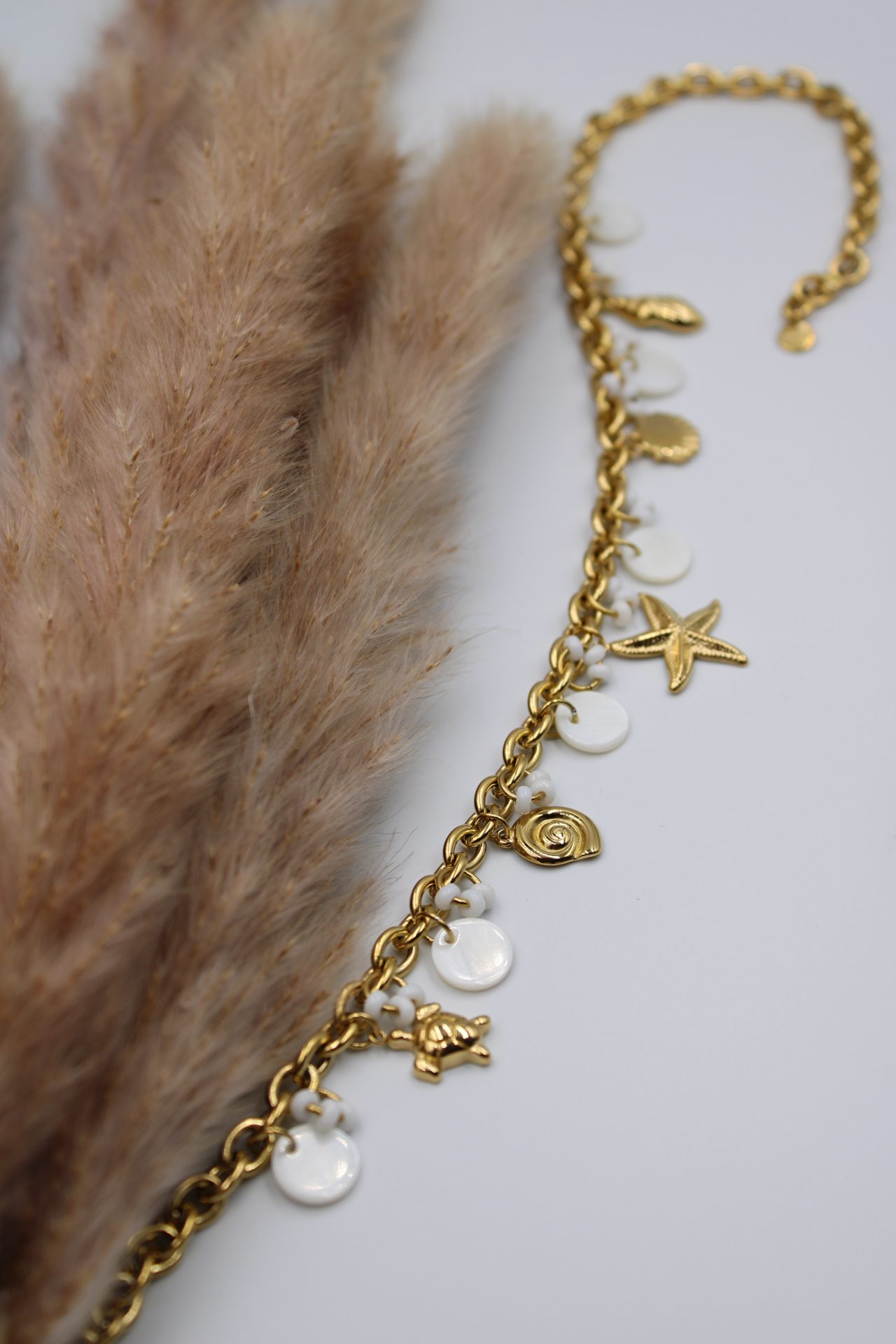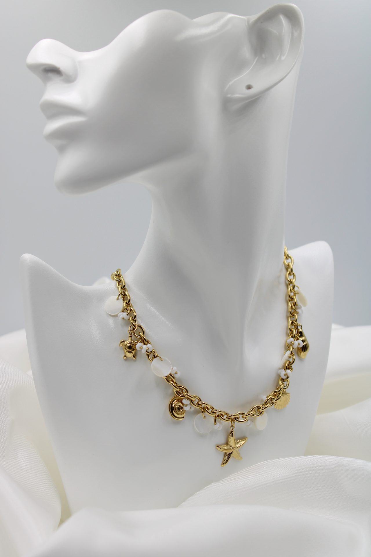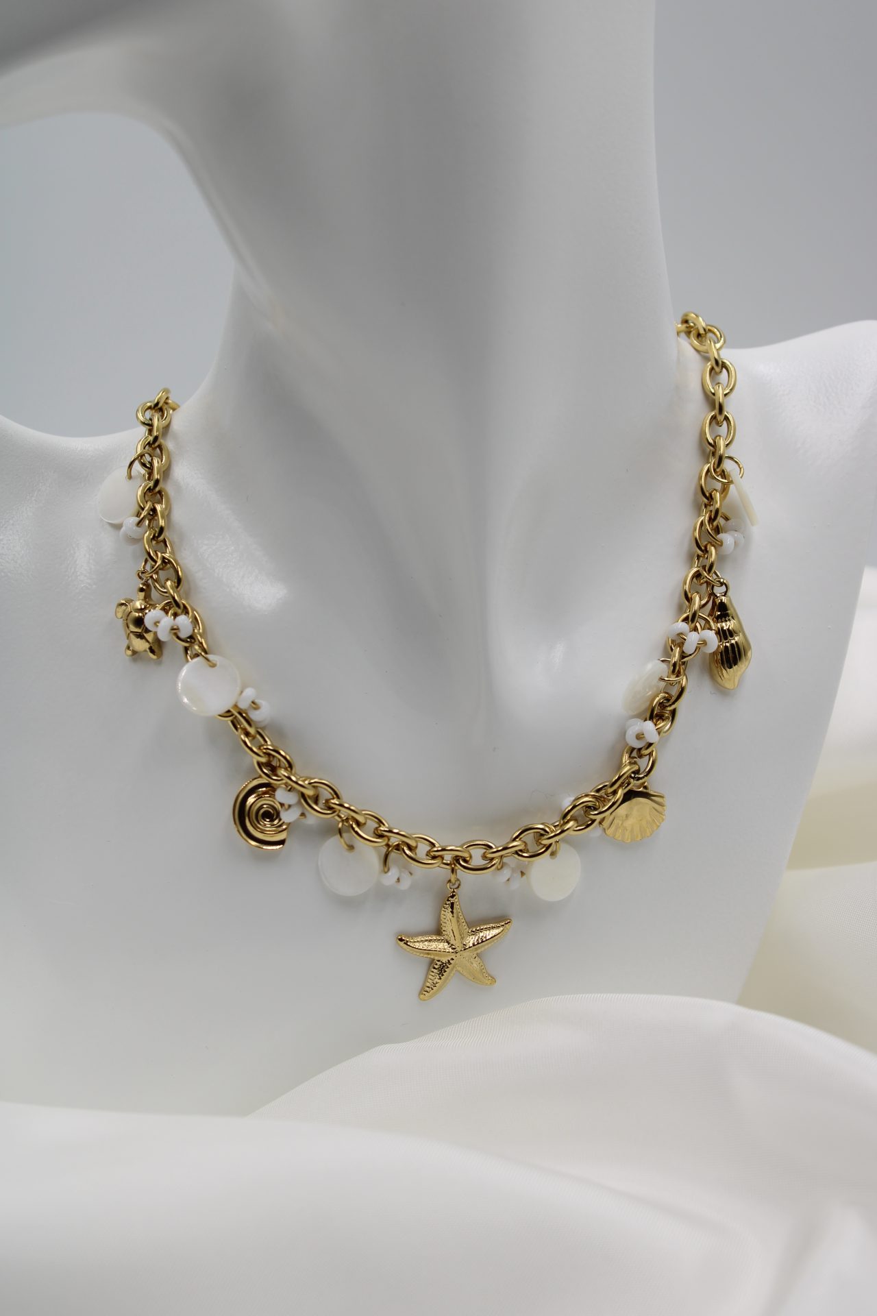 Ce collier élégant et estival est composé d’une chaîne dorée robuste agrémentée de breloques coquillages et étoiles de mer. Les détails blancs créent un contraste saisissant avec l’or, évoquant des souvenirs de vacances à la plage. Idéal pour ajouter une touche bohème chic à votre tenue.