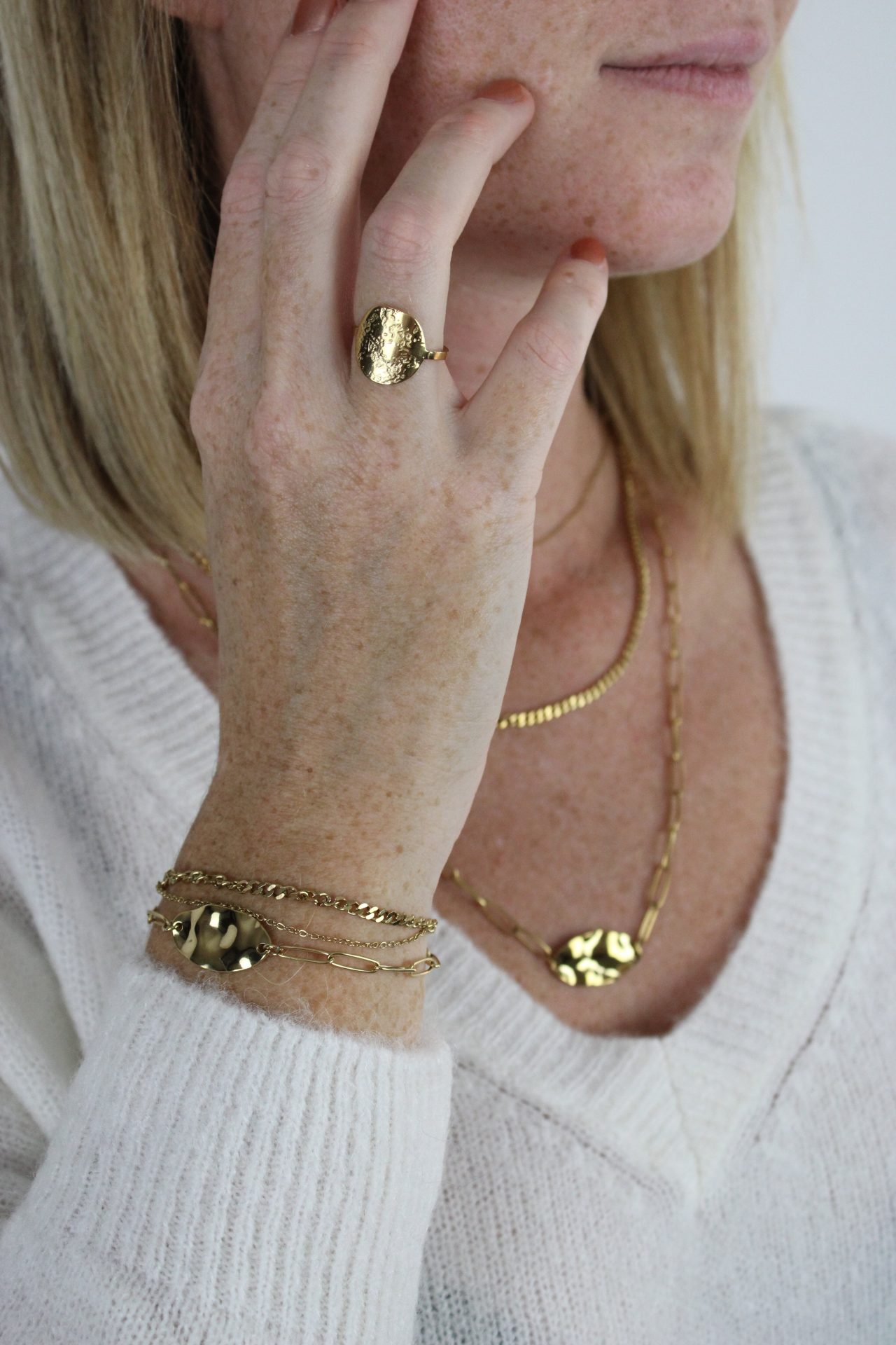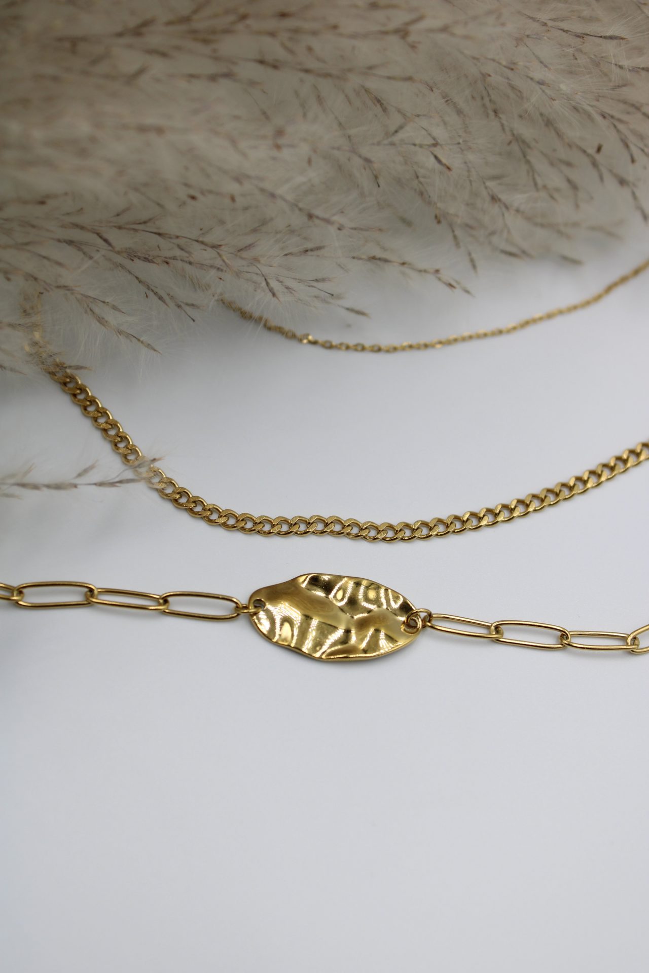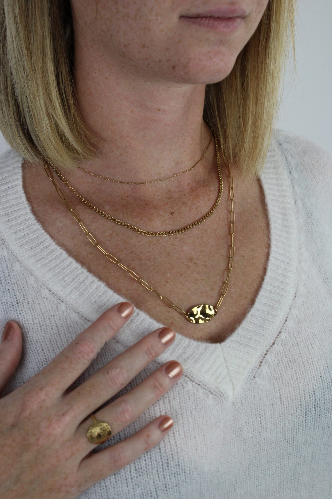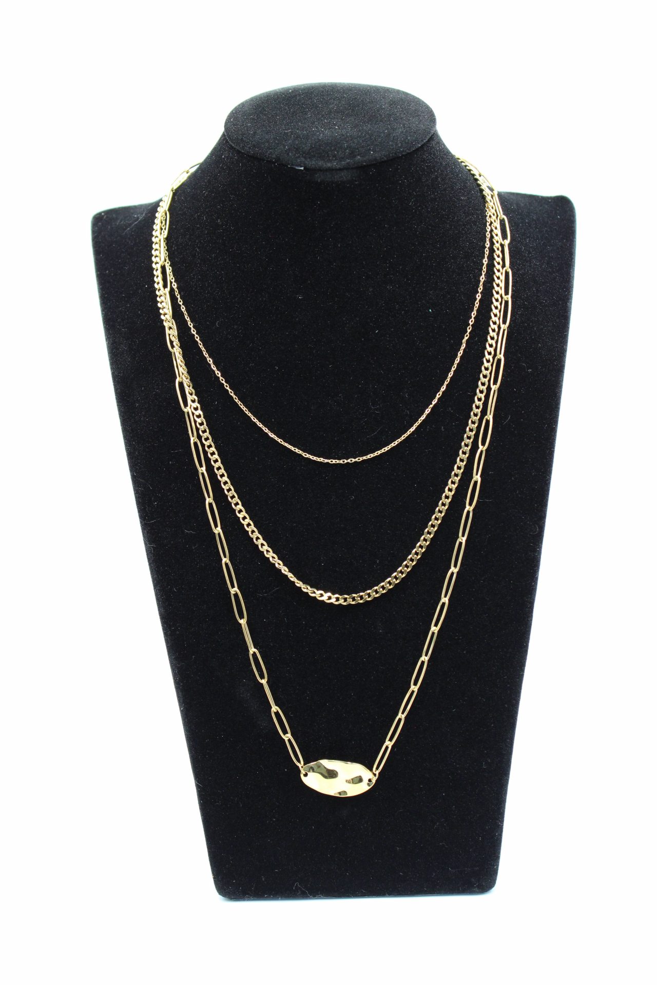Découvrez notre collier à trois chaînes raffinées et sa médaille martelée. Ce collier nous offre un joli mélange entre la délicatesse et force qui s’entrechoquent.