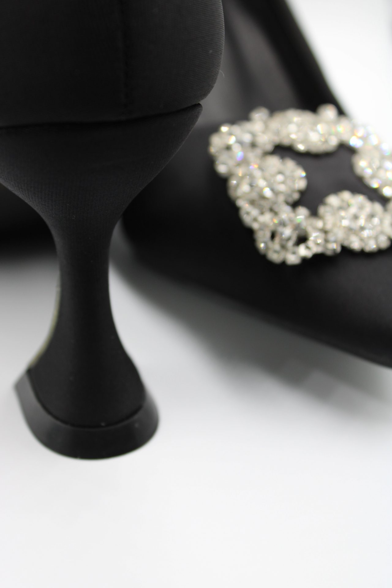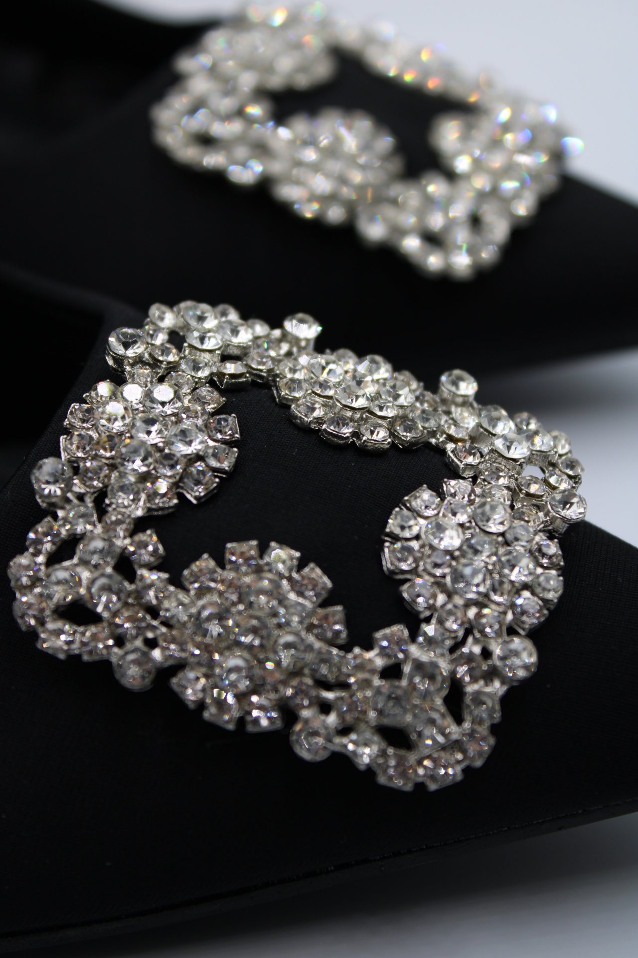 Les escarpins à talon ! On crush sur leur design pointu, leur noir intense satiné et surtout leurs strass qui font toute la différence