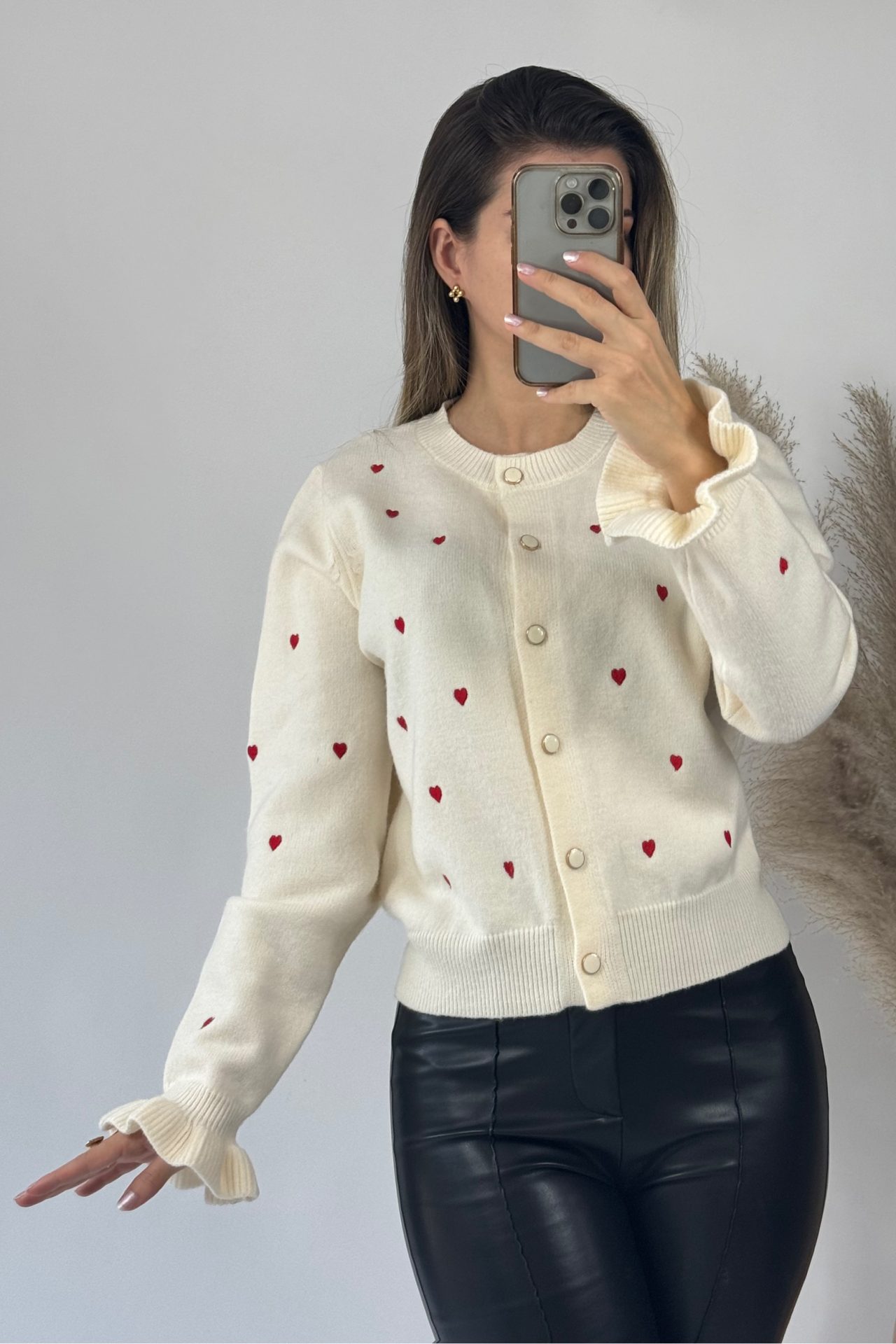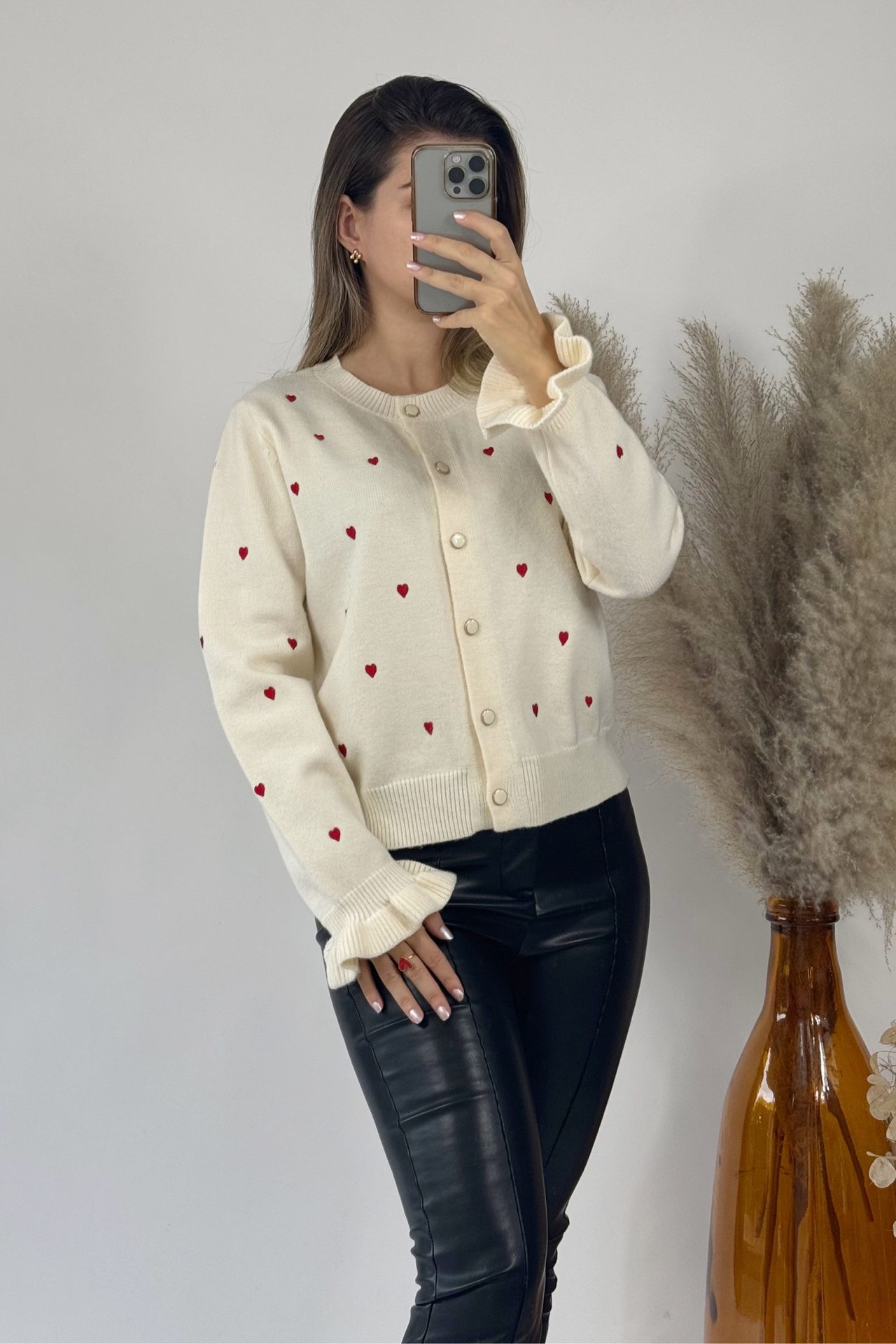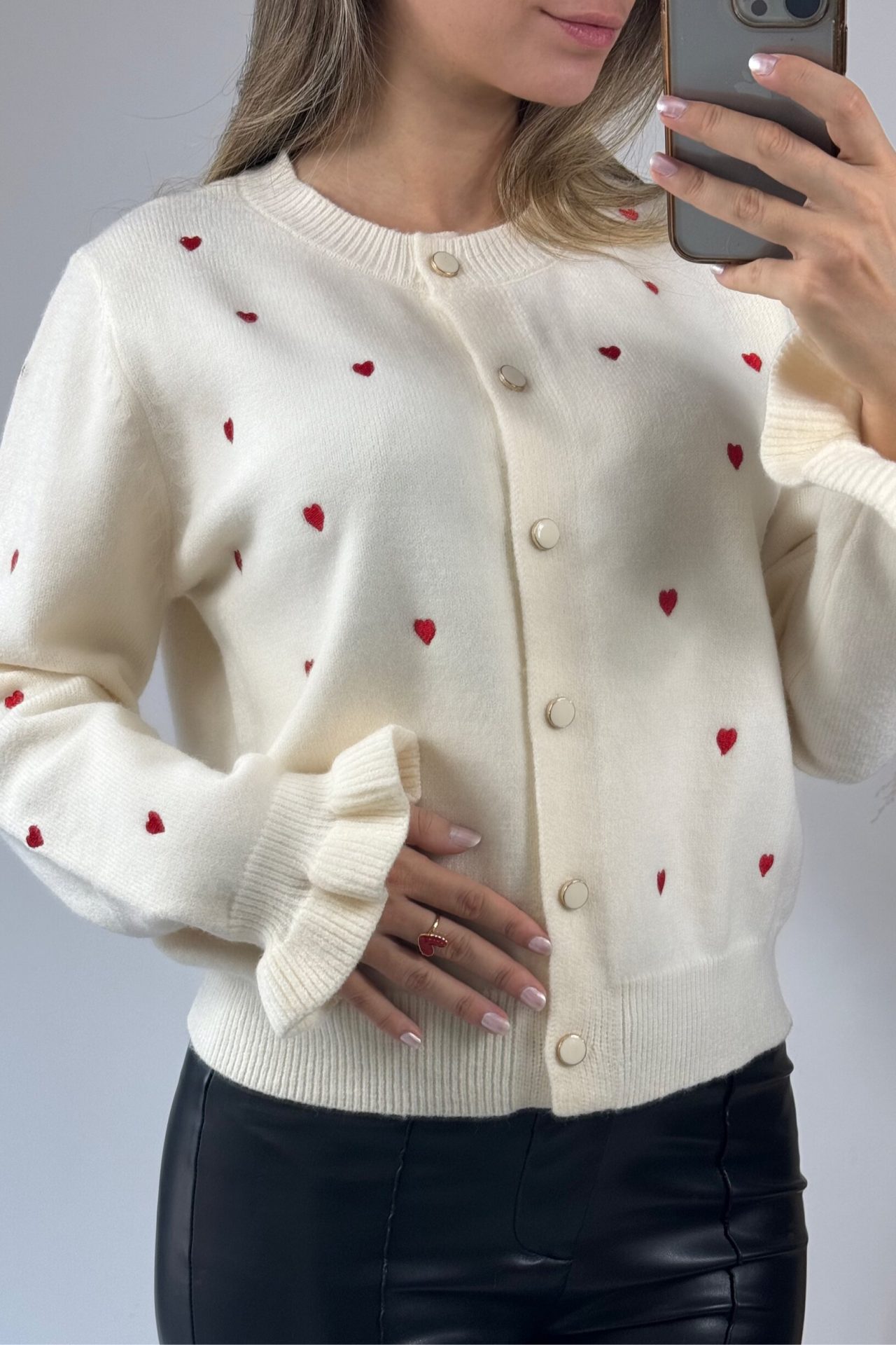 Faites fondre les cœurs avec notre gilet crème délicatement brodé de petits cœurs rouges ! Ce modèle chic et confortable est idéal pour ajouter une touche de douceur à vos tenues. Avec sa fermeture à boutons en métal et ses manches longues à poignets froncés, il allie élégance et confort. Un indispensable pour un style à la fois ludique et raffiné !
