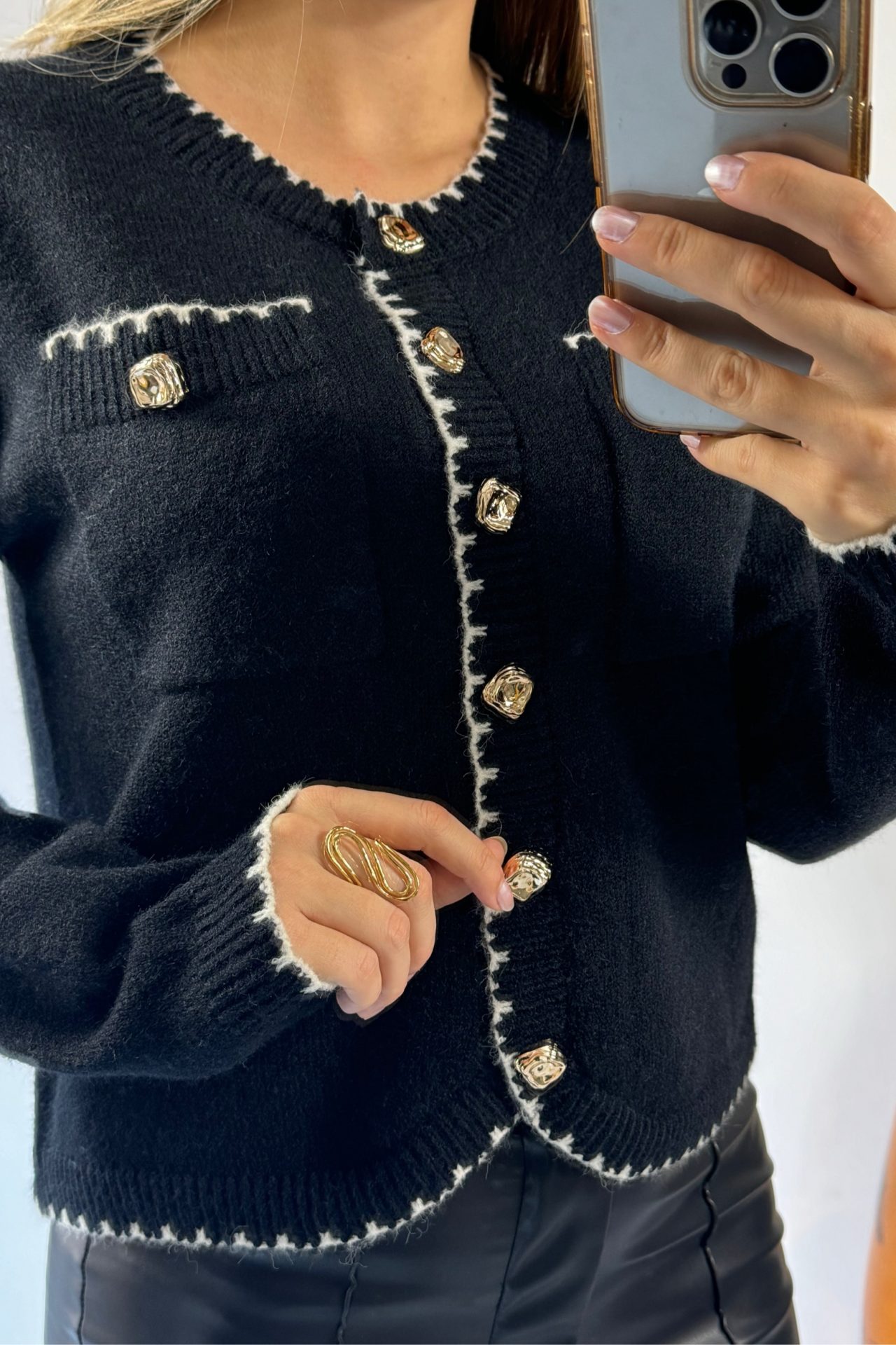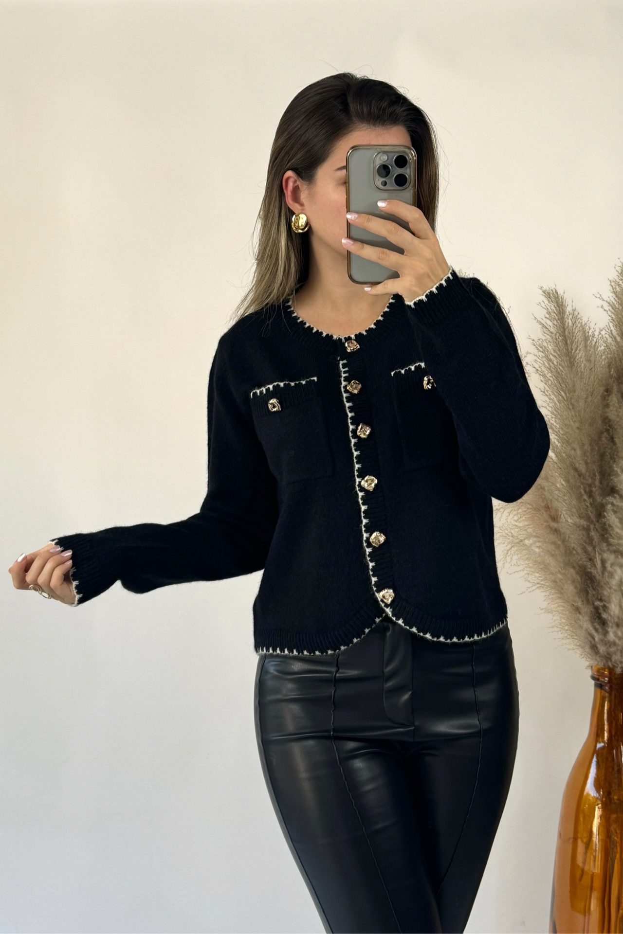 Découvrez notre gilet noir chic et intemporel. Avec ses détails en contraste blanc et ses boutons dorés, il apporte une touche d’élégance à n’importe quelle tenue. Confortable et stylé, il est parfait pour les journées fraîches. Un essentiel à avoir dans votre garde-robe !