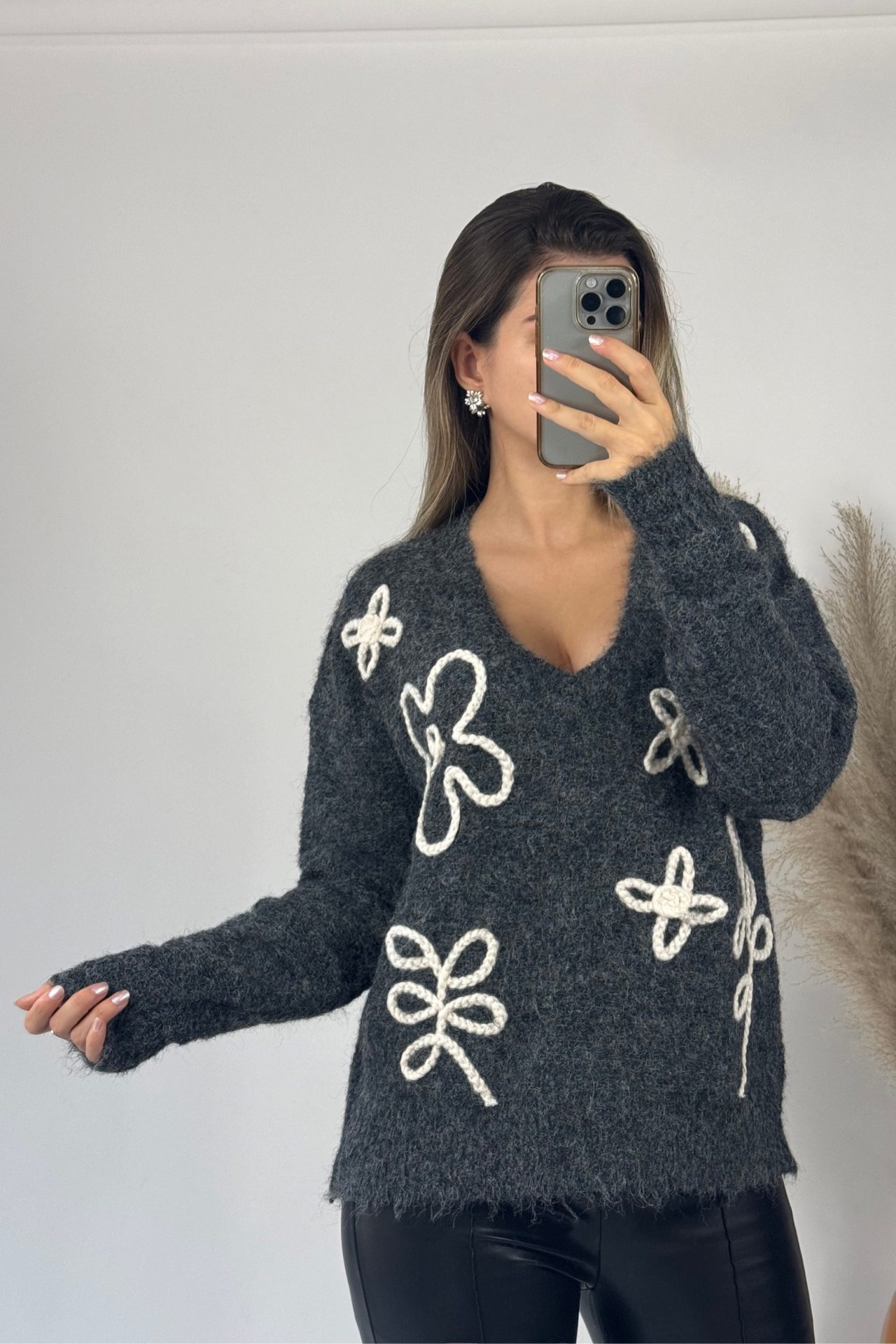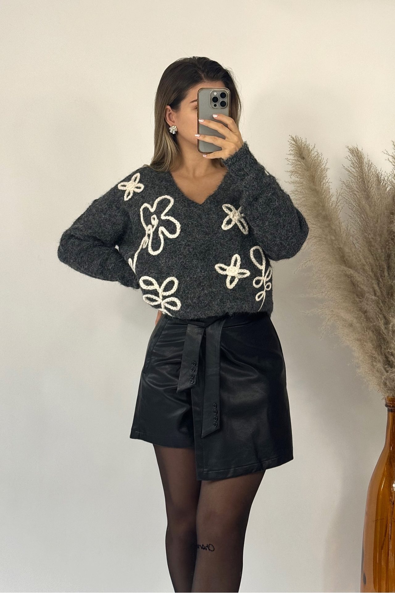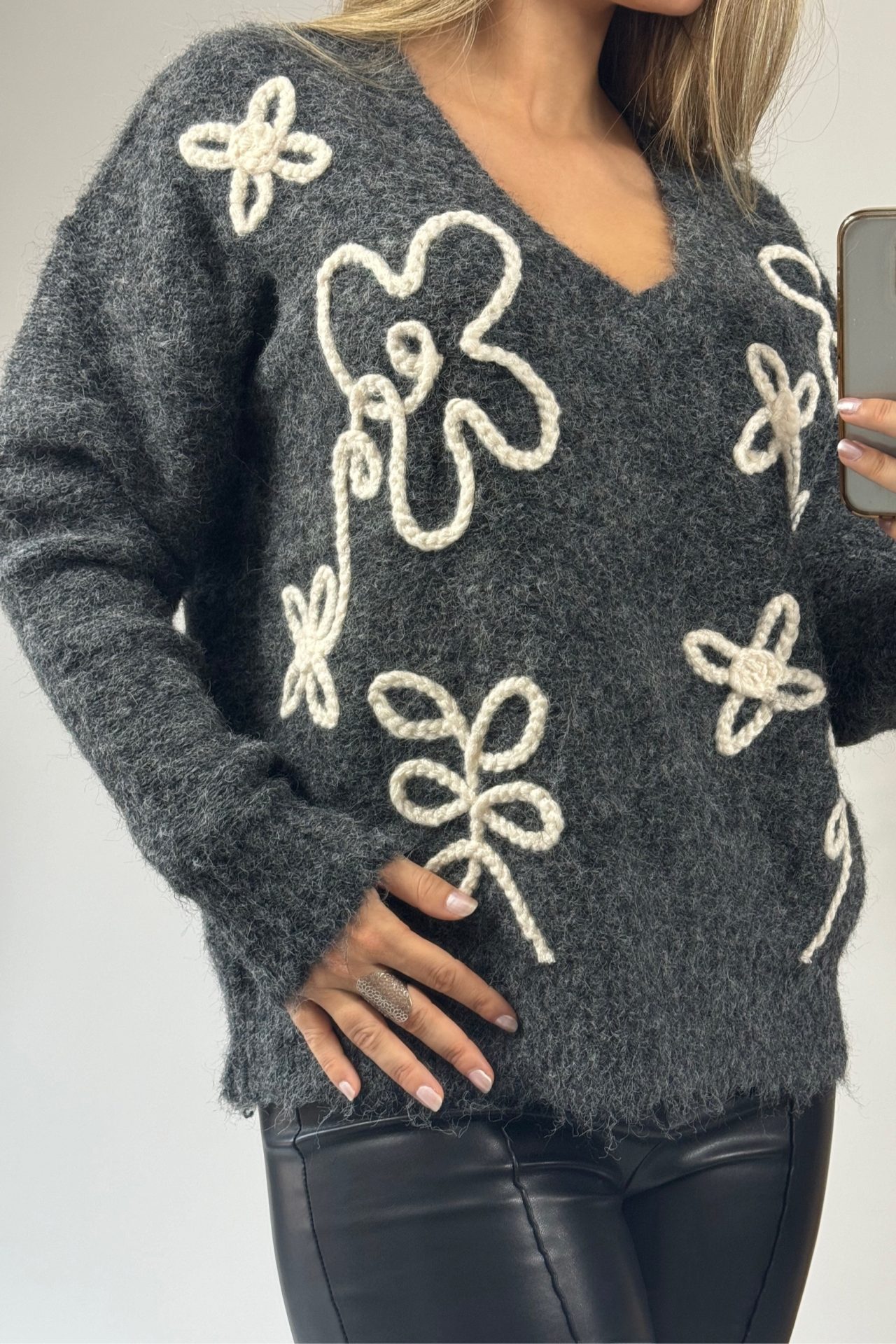Découvrez notre pull gris tout doux , parfait pour allier confort et style. Avec son col en V et ses motifs floraux en relief, il apporte une touche de charme à vos tenues. Idéal pour les journées fraîches, ce pull se marie facilement avec vos jeans ou jupes préférés pour un look décontracté et élégant.