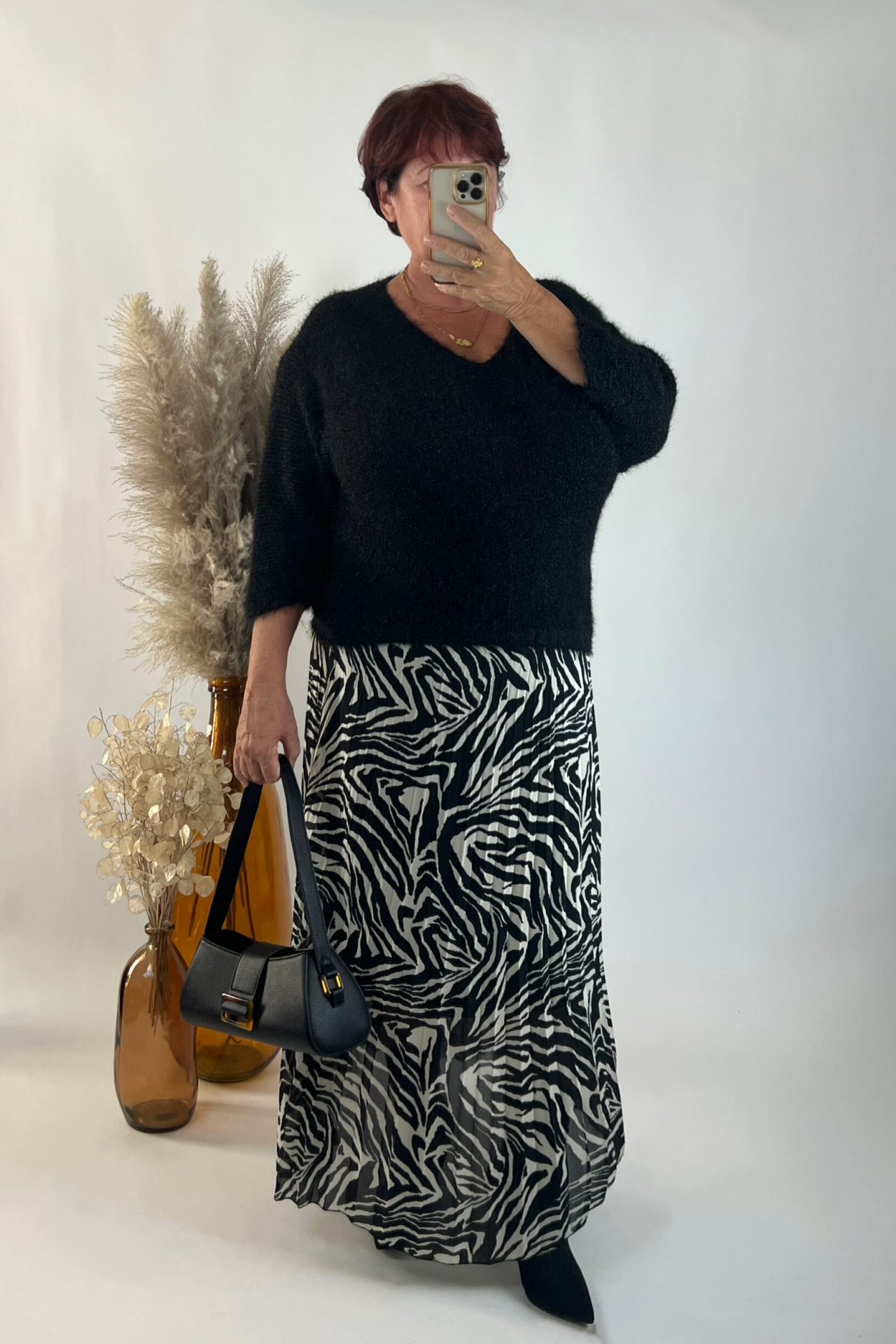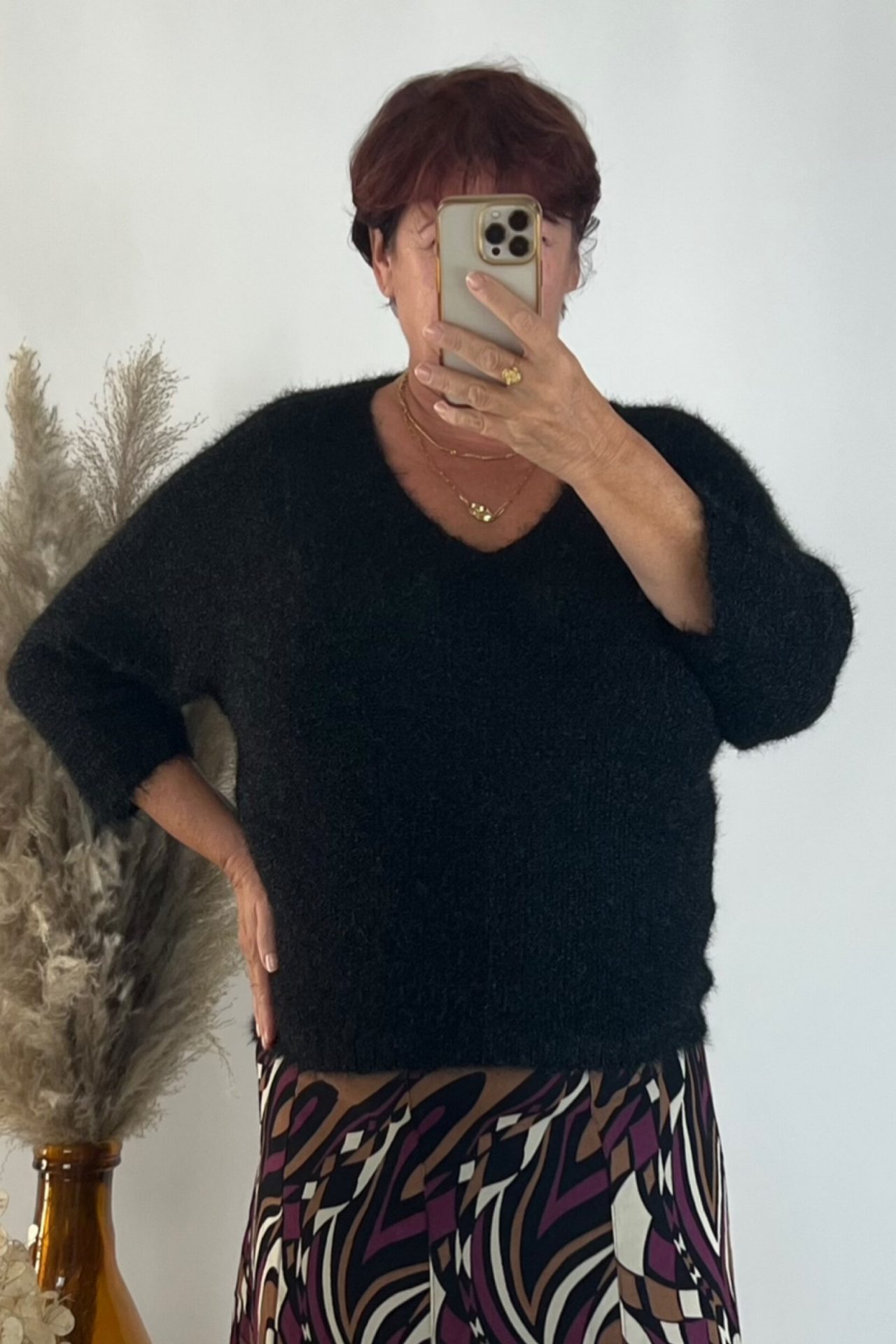 Toujours besoin d’un pull noir et on adore celui-ci ! Avec son col V , sa douceur et son design classique, c’est le pull qui nous suit toute la saison.