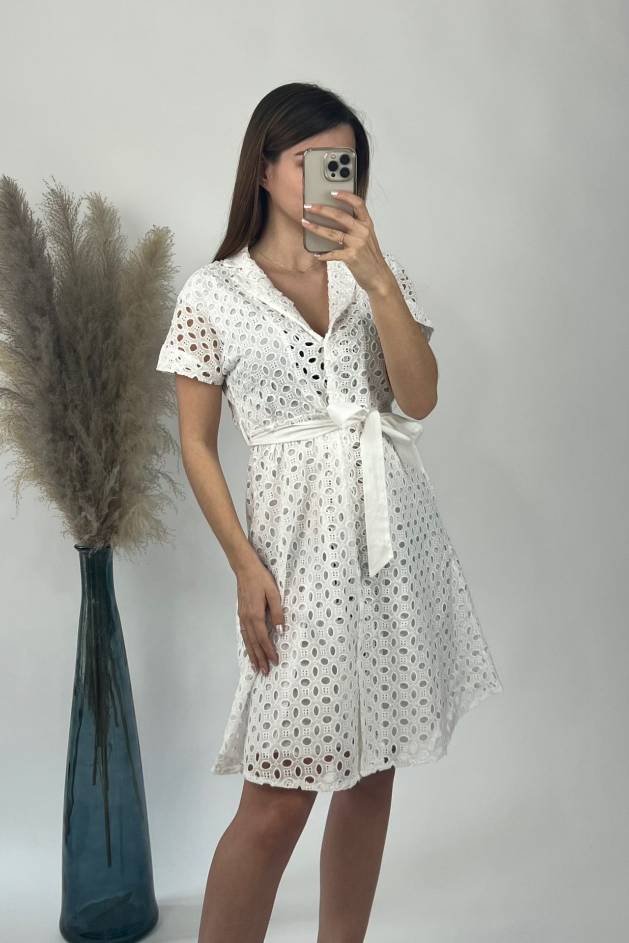 La robe courte , ceinturée à la taille, est une pièce élégante et intemporelle pour toutes les occasions. Tout d’abord, la broderie anglaise apporte une touche de raffinement et de délicatesse à la tenue. Ensuite, la ceinture souligne joliment la taille, créant une silhouette élégante et féminine. Le col chemisier avec des boutons apporte une note classique et sophistiquée à la robe.