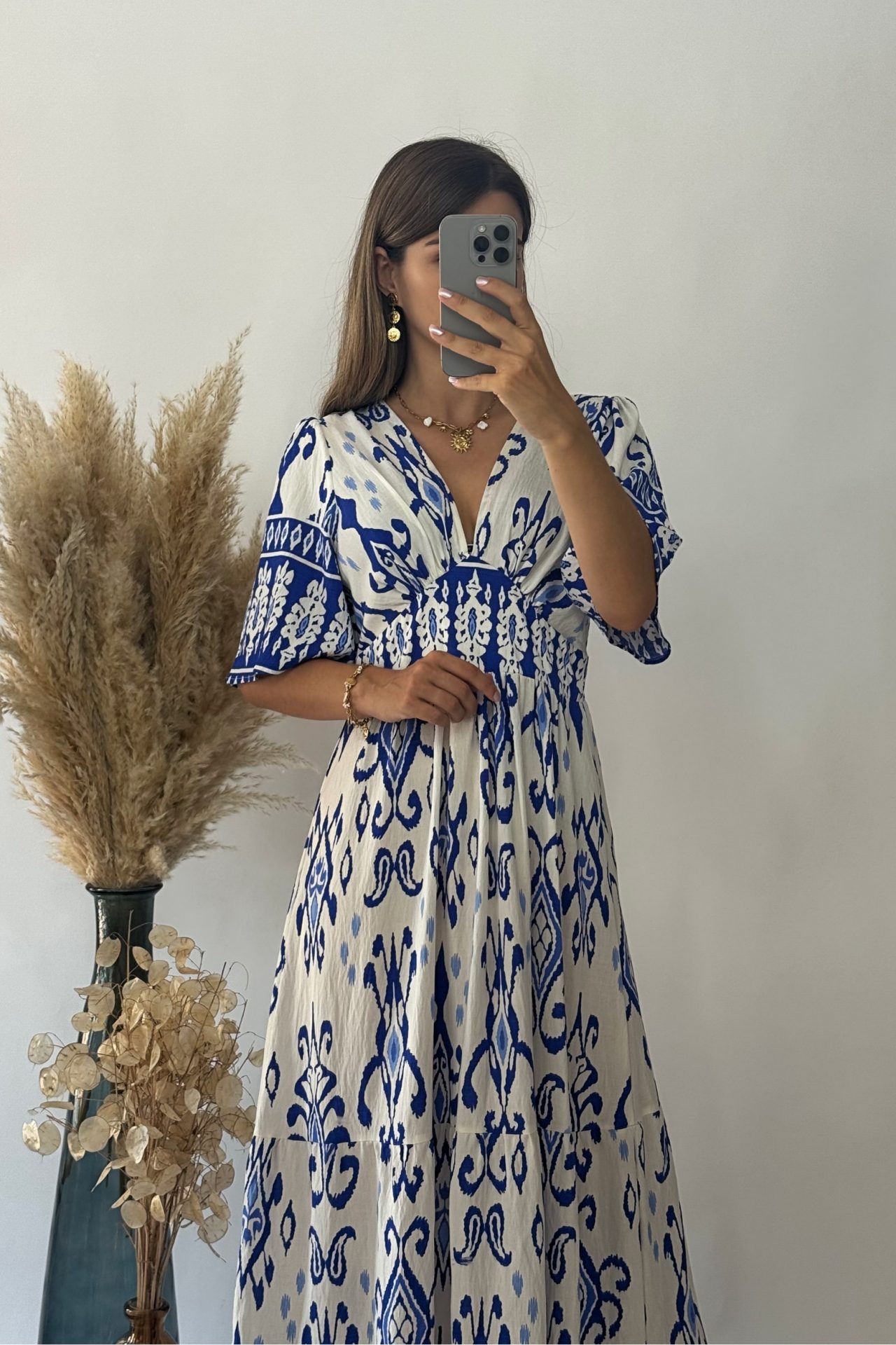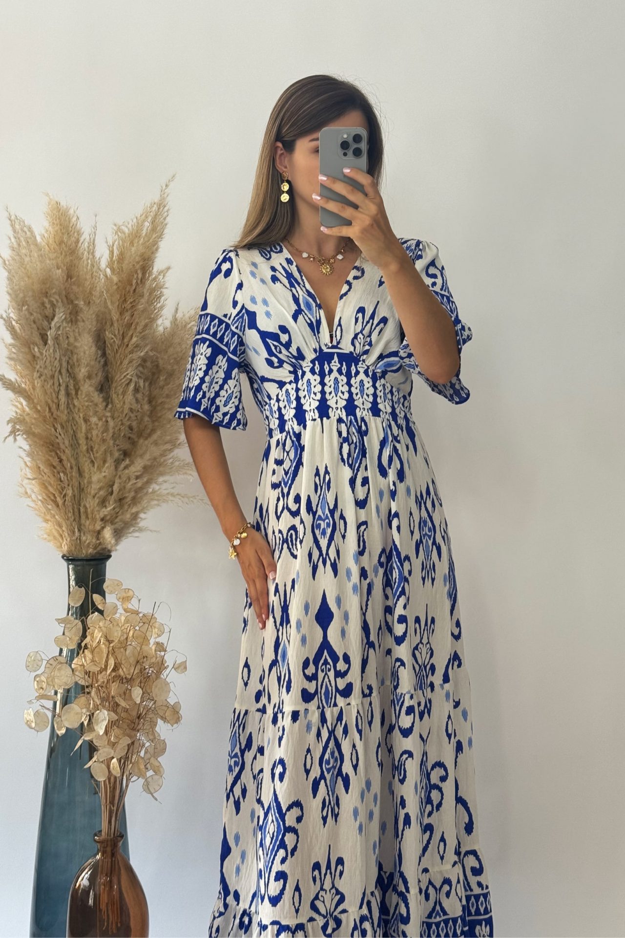 Craquez pour l’élégance méditerranéenne avec cette superbe robe longue esprit grec, au motif bleu roi éclatant sur fond blanc lumineux. Son imprimé inspiré des céramiques grecques traditionnelles vous transporte instantanément sur les îles, entre ciel et mer.