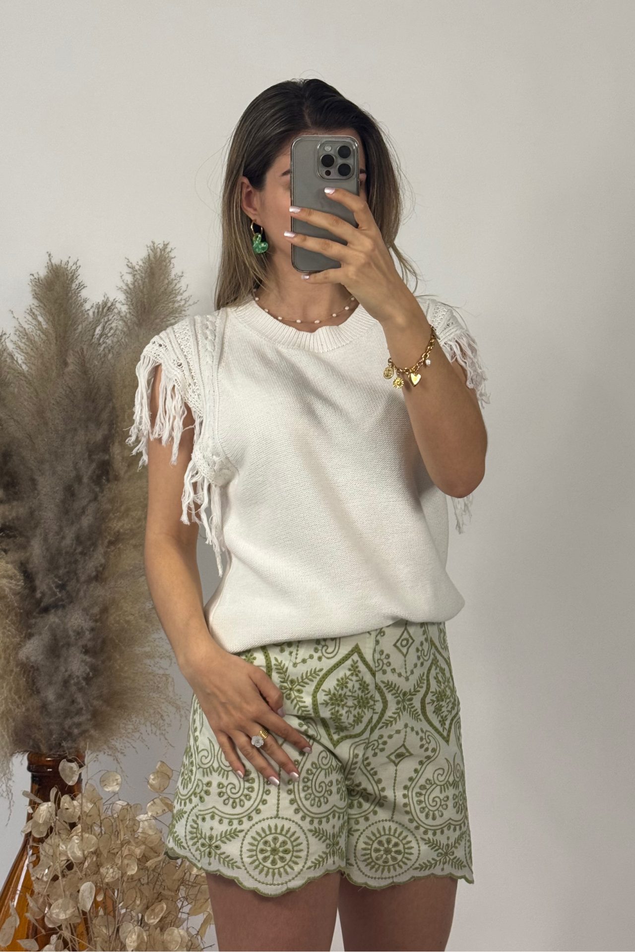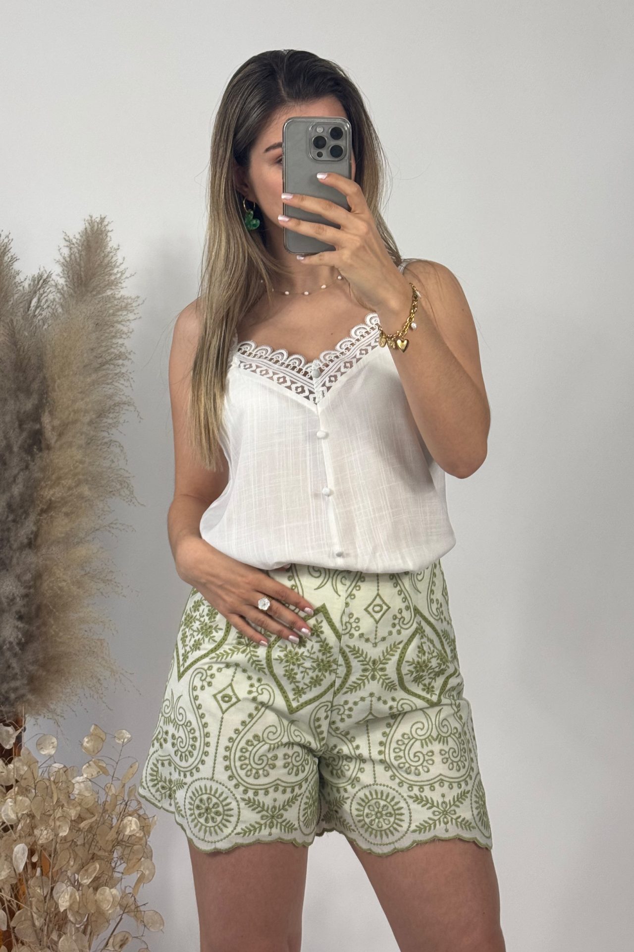 Ce short vert olive est rehaussé de broderies délicates qui lui donnent un charme unique. La couleur douce et naturelle du short se marie facilement avec différents styles, tandis que les détails brodés apportent une touche d’originalité et d’élégance.