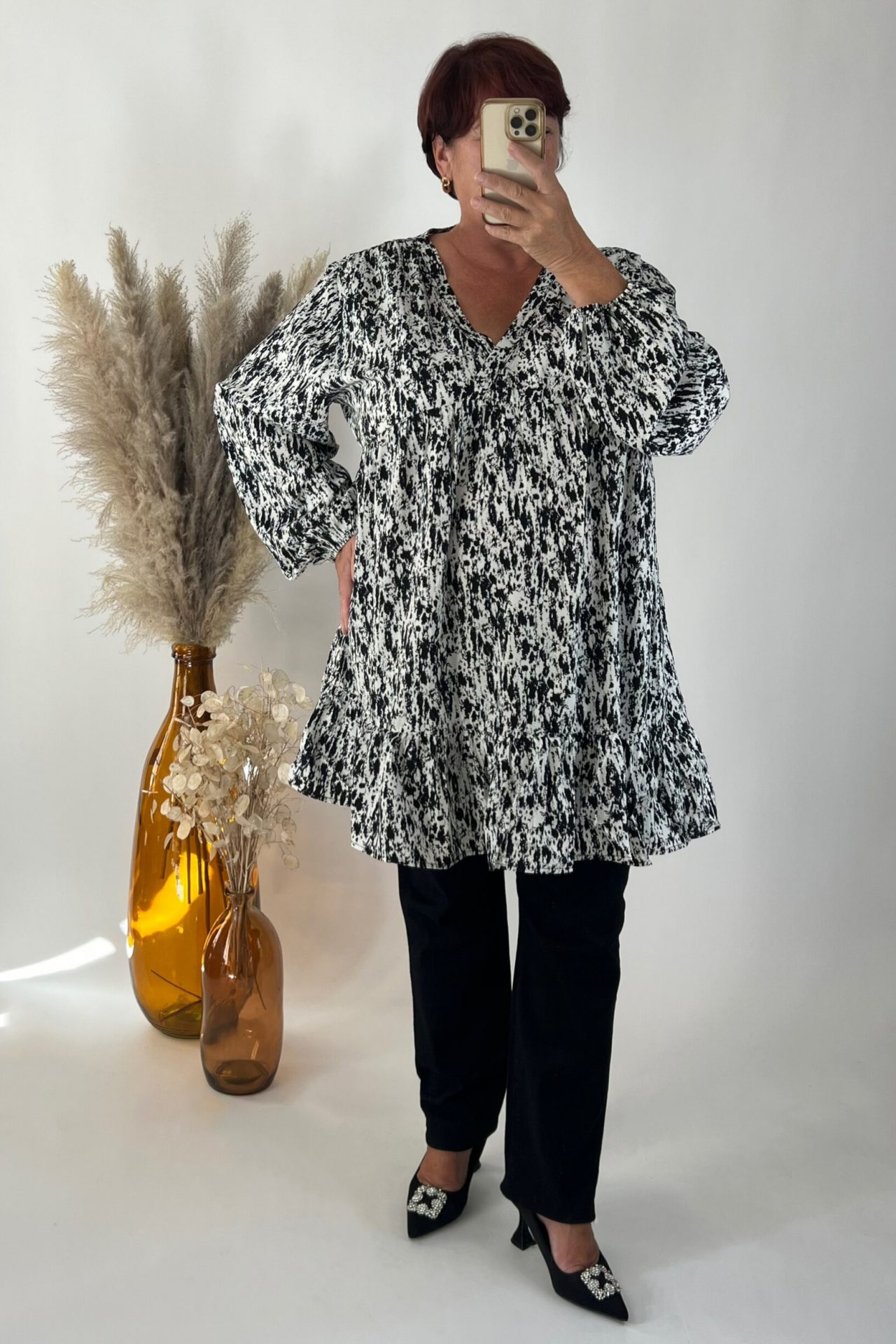 Avec son imprimé abstrait , ses manches bouffantes, sa coupe fluide et son design col V, ce top a tout pour faire plaisir. Il sublimera votre silhouette!